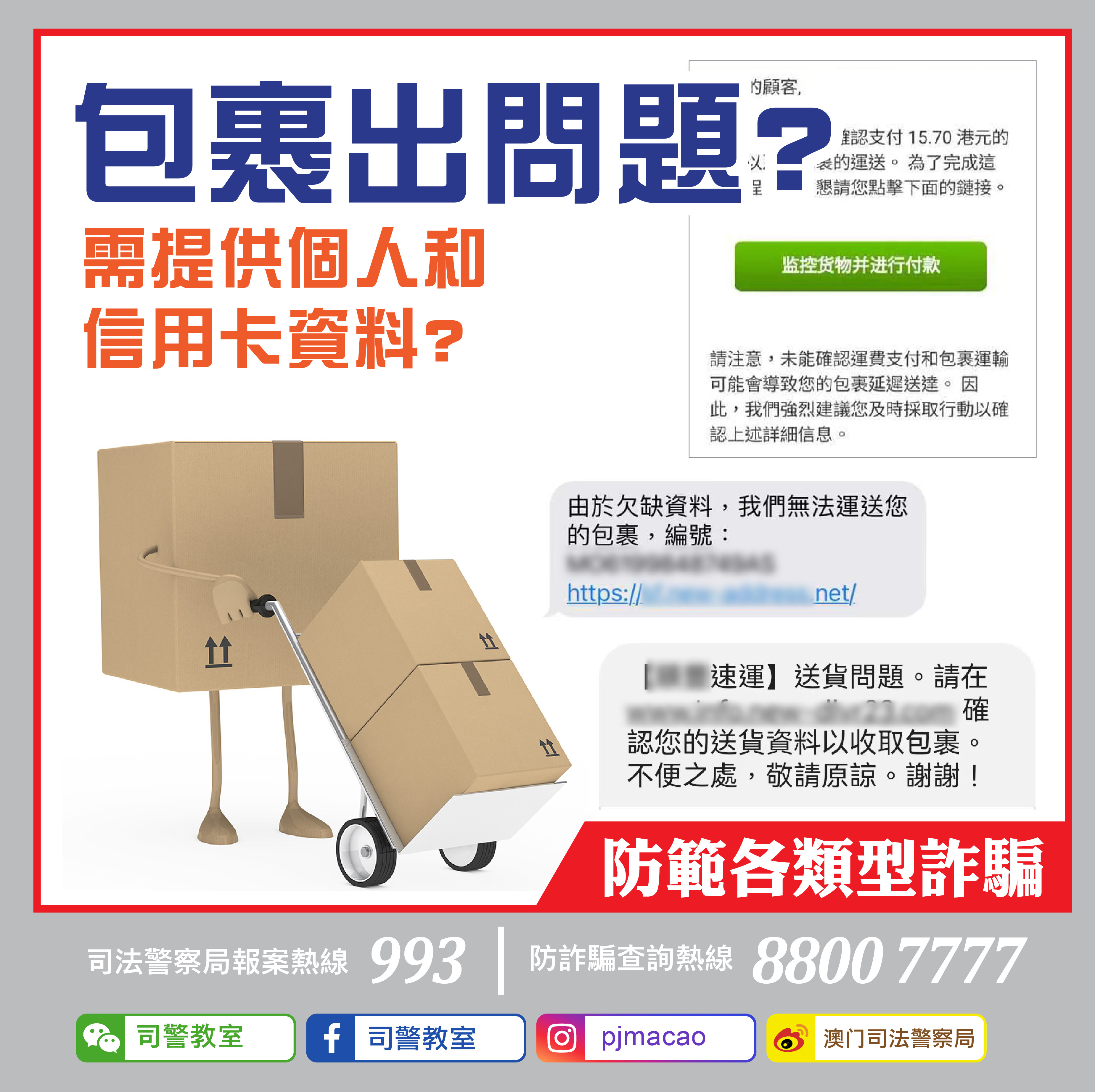 司警局近日接獲多名市民反映,稱手機收到不明來電、附有不明連結的短訊或電郵,均指其包裹因資料不全或運費不足而無法送遞,要求提供個人和信用卡資料。