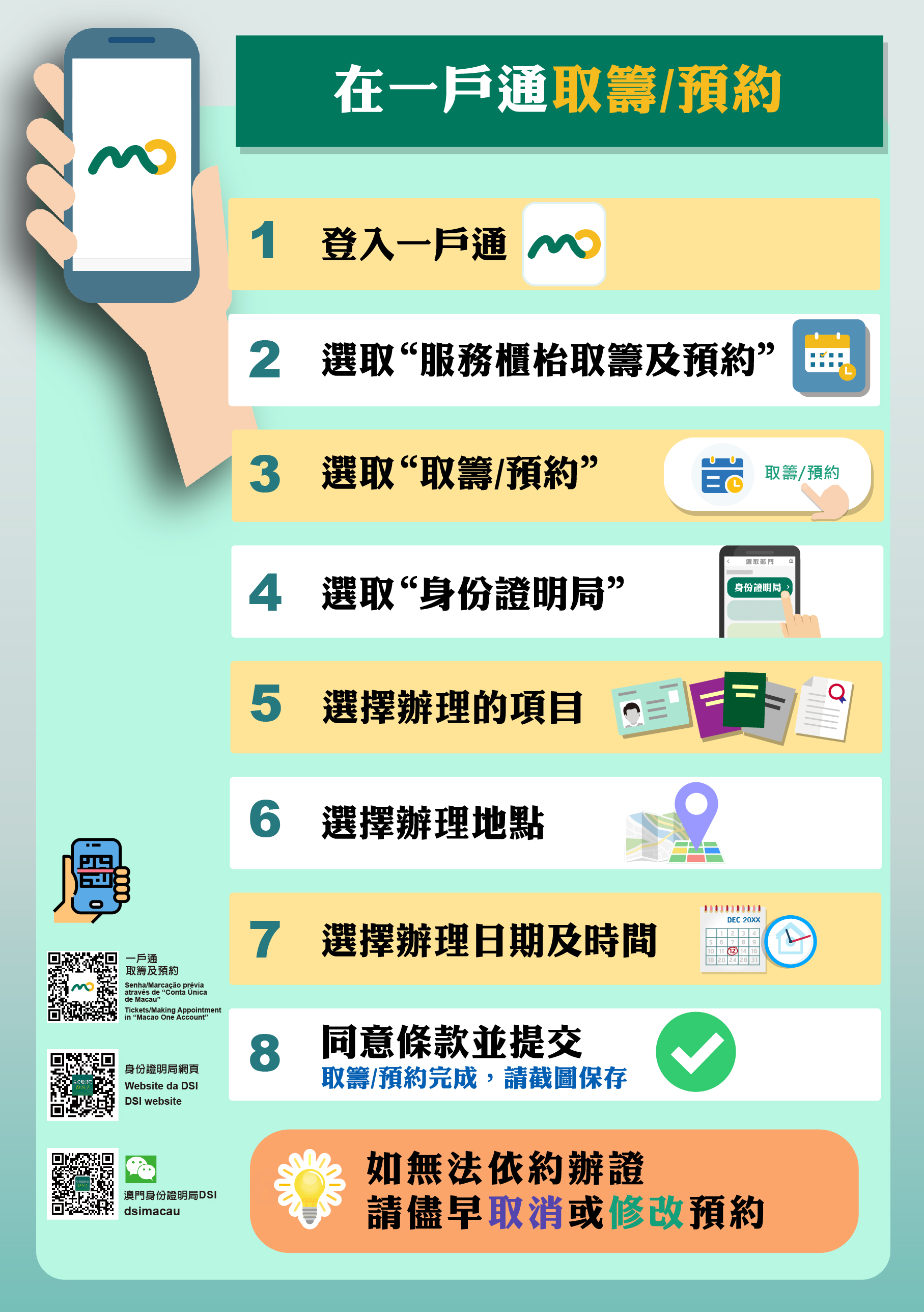 市民可於“一戶通”內的“服務櫃檯取籌及預約”或身份證明局網頁 www.dsi.gov.mo 進行預約及按時前往辦證,新增時段的現場不設取籌,在上述時間領取證件無需預約。市民倘無法按預約時間辦證,亦可透過“一戶通”或身份證明局網頁取消或更改預約,以釋放名額供其他人士使用。