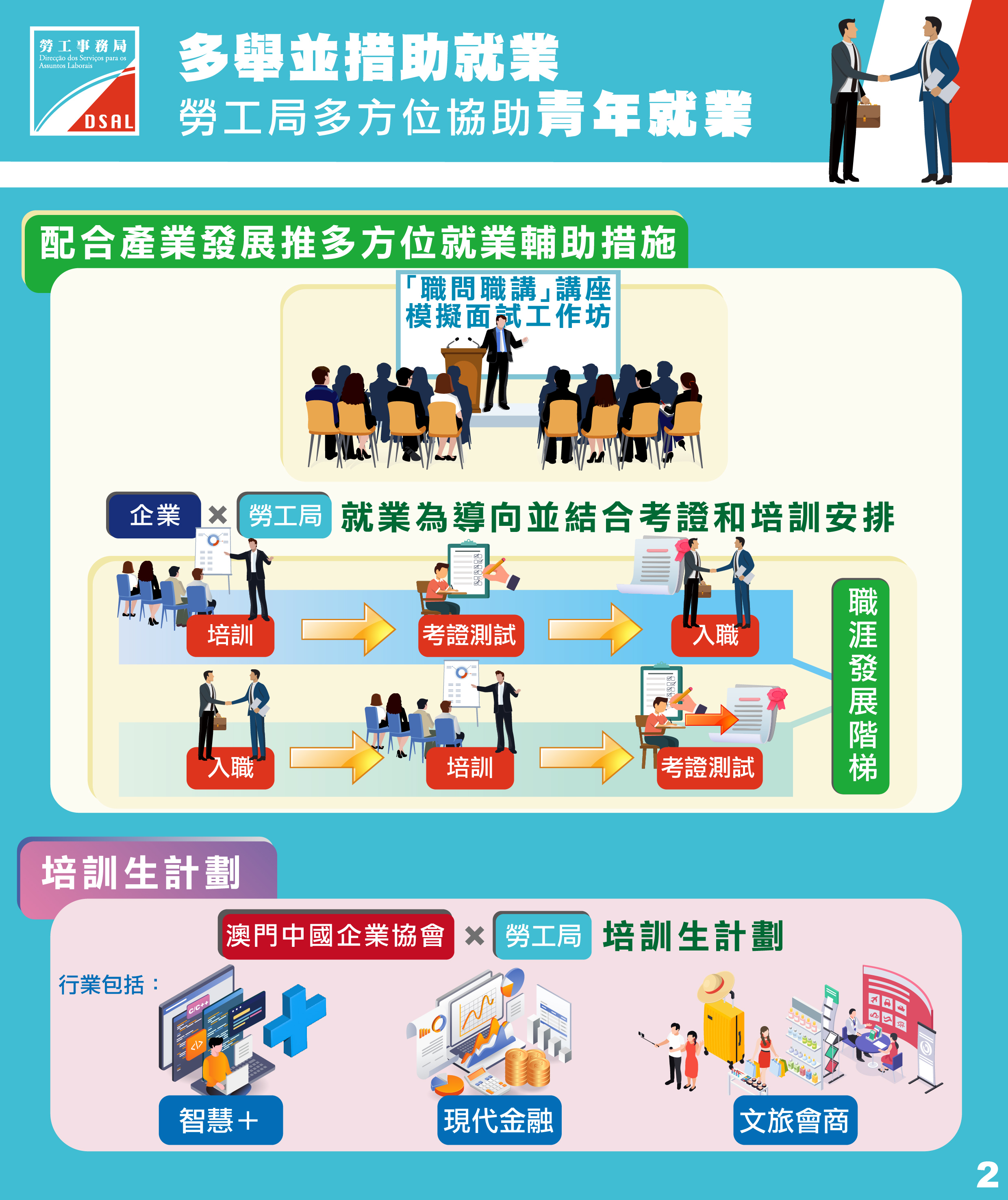 勞工局一直關注本澳居民的就業情況和職業發展,過去三年持續針對性地推出各項輔助就業的支援措施。包括舉辦恆常及專場配對會,推出實習/見習計劃,讓青年認識產業發展前景及拓展就業發展空間,透過“職問職講”行業講座,向青年推廣新興產業的發展前景及就業市場的資訊,務求從不同層面全力協助青年盡快投入職場。