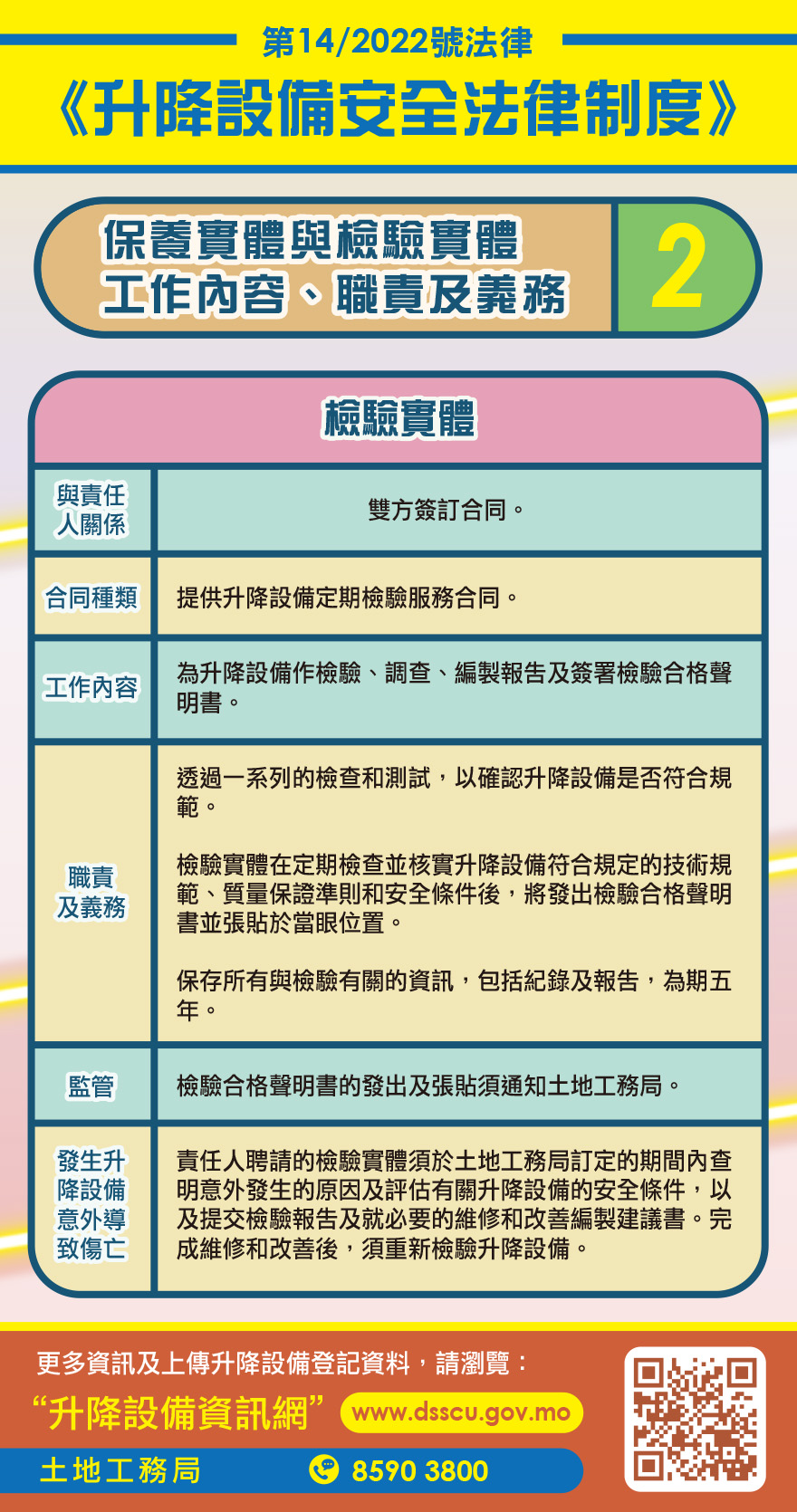 升降設備的安全關係到千家萬戶,因此對相關設備作定期保養及檢驗至關重要。第14/2022號法律《升降設備安全法律制度》透過制度化及規範化管理,令升降設備的使用更有安全保障,包括明確由合資格的保養實體負責對升降設備作恆常的維修保養,並由專業檢驗實體作每年一次定期檢驗等工作。