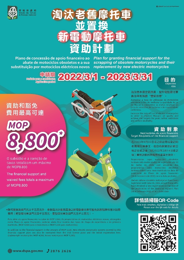 特區政府於2022年3月、9月中旬分別推出《淘汰老舊摩托車並置換新電動摩托車資助計劃》、《淘汰老舊柴油車資助計劃》,目的是鼓勵車主淘汰較高污染的老舊電單車或柴油車,進一步改善空氣質素及保障居民健康,同時鼓勵電單車車主有需要時置換新電動電單車,以提升電動電單車的普及率。兩項資助計劃的執行情況大致暢順,並已達到一定成效。