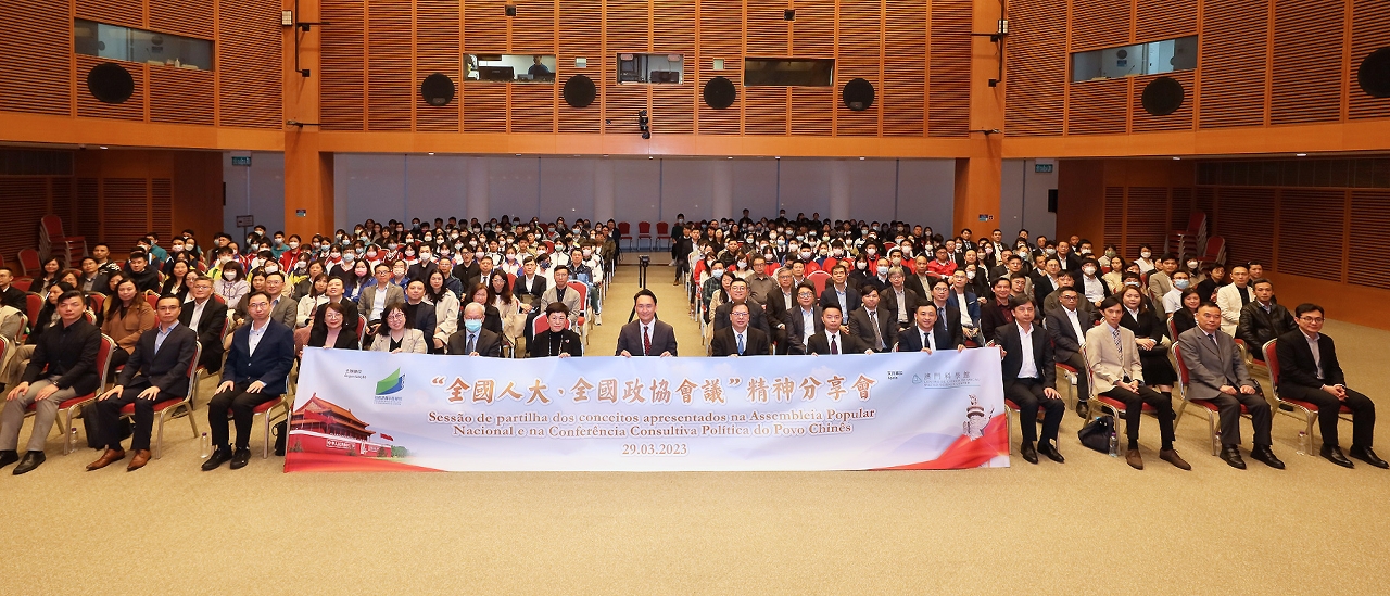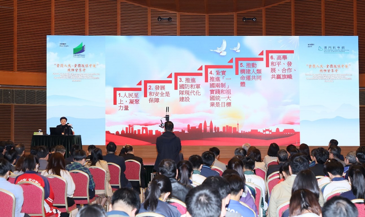 陳虹以“人民至上”、“高質量發展”和“團結奮鬥”等關鍵詞,以點帶面介紹兩會的重大原則、會議成果及政治體制等內容,特別講述近年國家的教育政策及教育發展成就,並透過圖片及視頻展示兩會的會議盛況,讓與會者感受禮兵護送《中華人民共和國憲法》進場及習近平主席宣誓等激動人心的時刻,勉勵本澳青年為強國建設、民族復興貢獻力量,努力開創繁榮發展新局面。