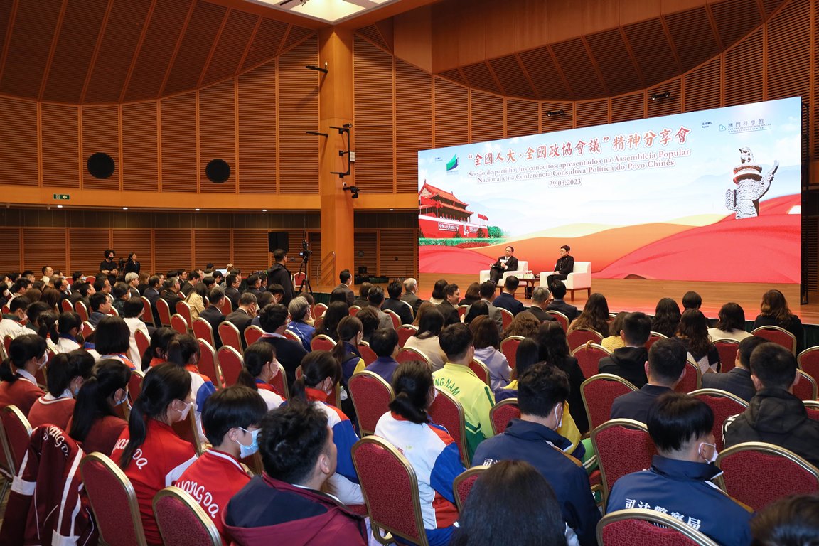 為鼓勵青年關心時事,準確認識國家的重大政策及澳門發展的方向,教育及青年發展局於2023年3月29日於澳門科學館會議中心舉行“全國人大、全國政協會議”精神分享會。活動邀請了澳區全國人大代表陳虹及澳區全國政協委員邱庭彪擔任主講嘉賓,向青年及學生介紹“人大”和“政協”的會議情況及國家工作報告重點。分享會共吸引了超過300名來自團體、高校及中學的學校代表、青年及學生參加。