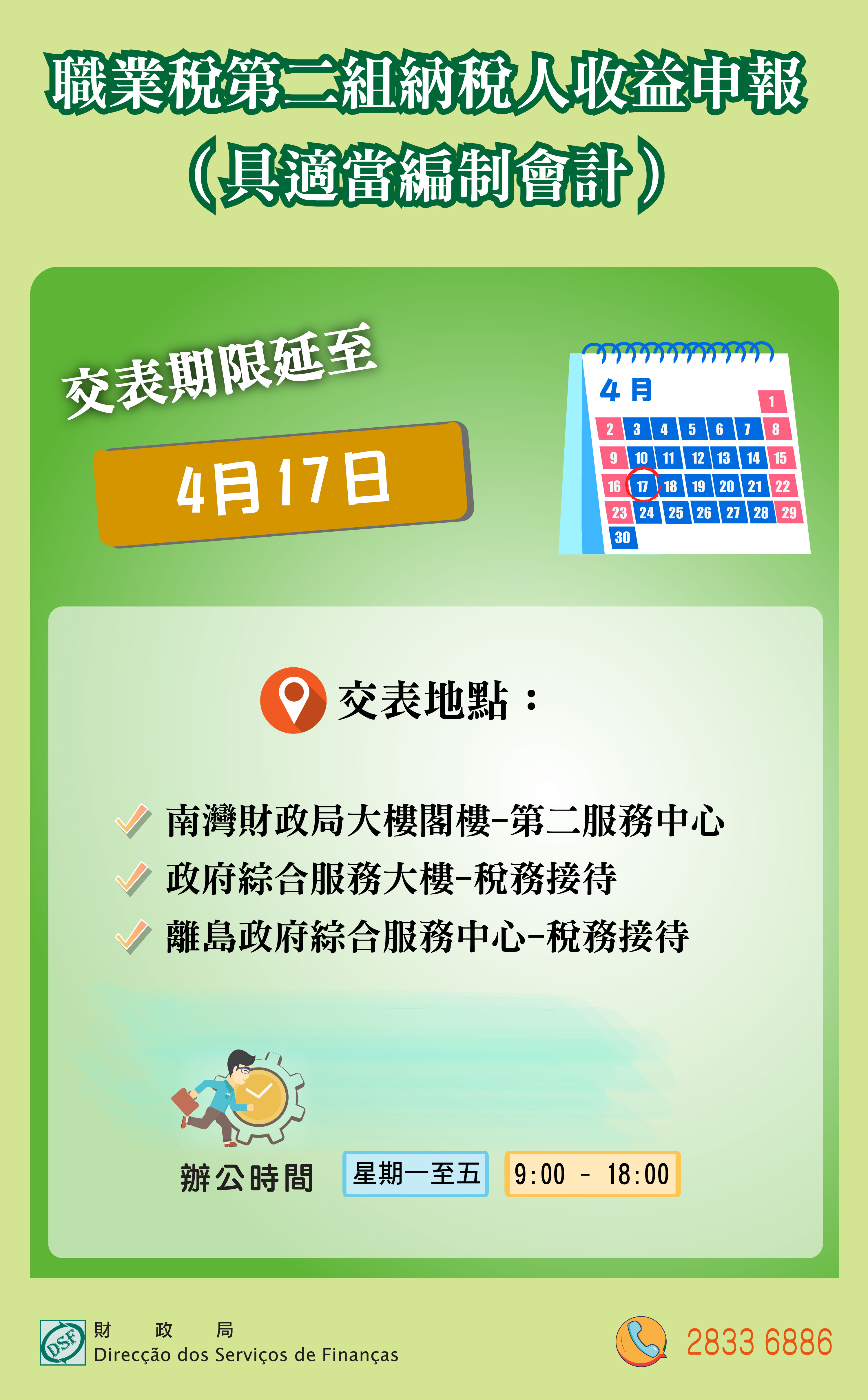 財政局呼籲仍未遞交上述收益申報書之納稅人,儘快於辦公時間內(星期一至五:上午九時至下午六時)到下列地點遞交: