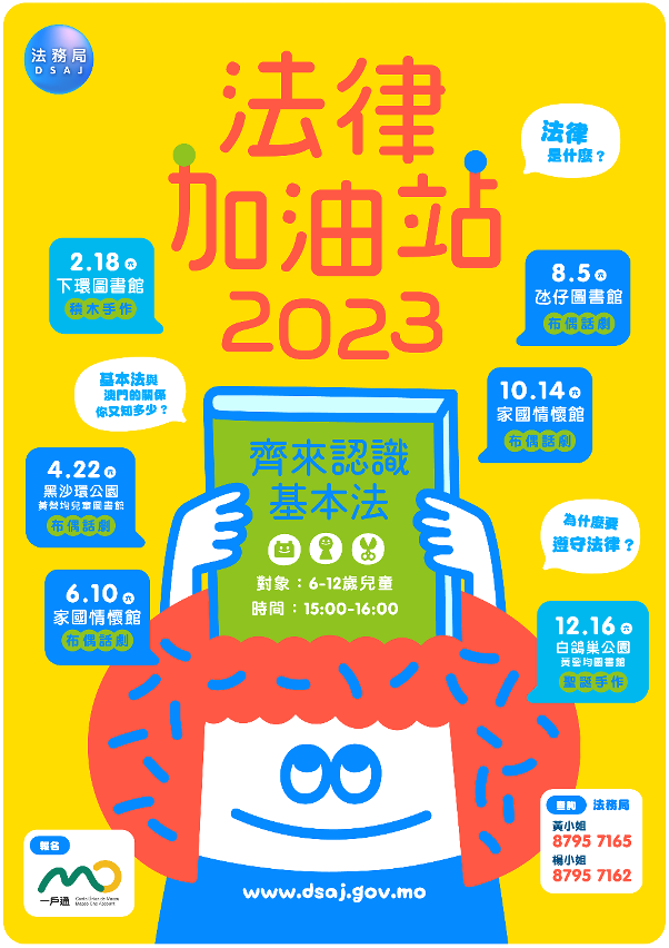 四場以兒童話劇形式舉辦的“法律加油站”活動將分別於4月22日、6月10日、8月5日和10月14日舉行,活動時間為下午3時至4時,現已接受報名,歡迎本澳6至12歲兒童及家長參加,有興趣者可透過一戶通的“活動報名”頁面報名,每場名額8對親子,如報名人數超過數量,將以電腦抽籤方式決定。如有任何查詢,歡迎致電法務局公共關係處黃小姐(8795 7165)或楊小姐(8795 7162)。
