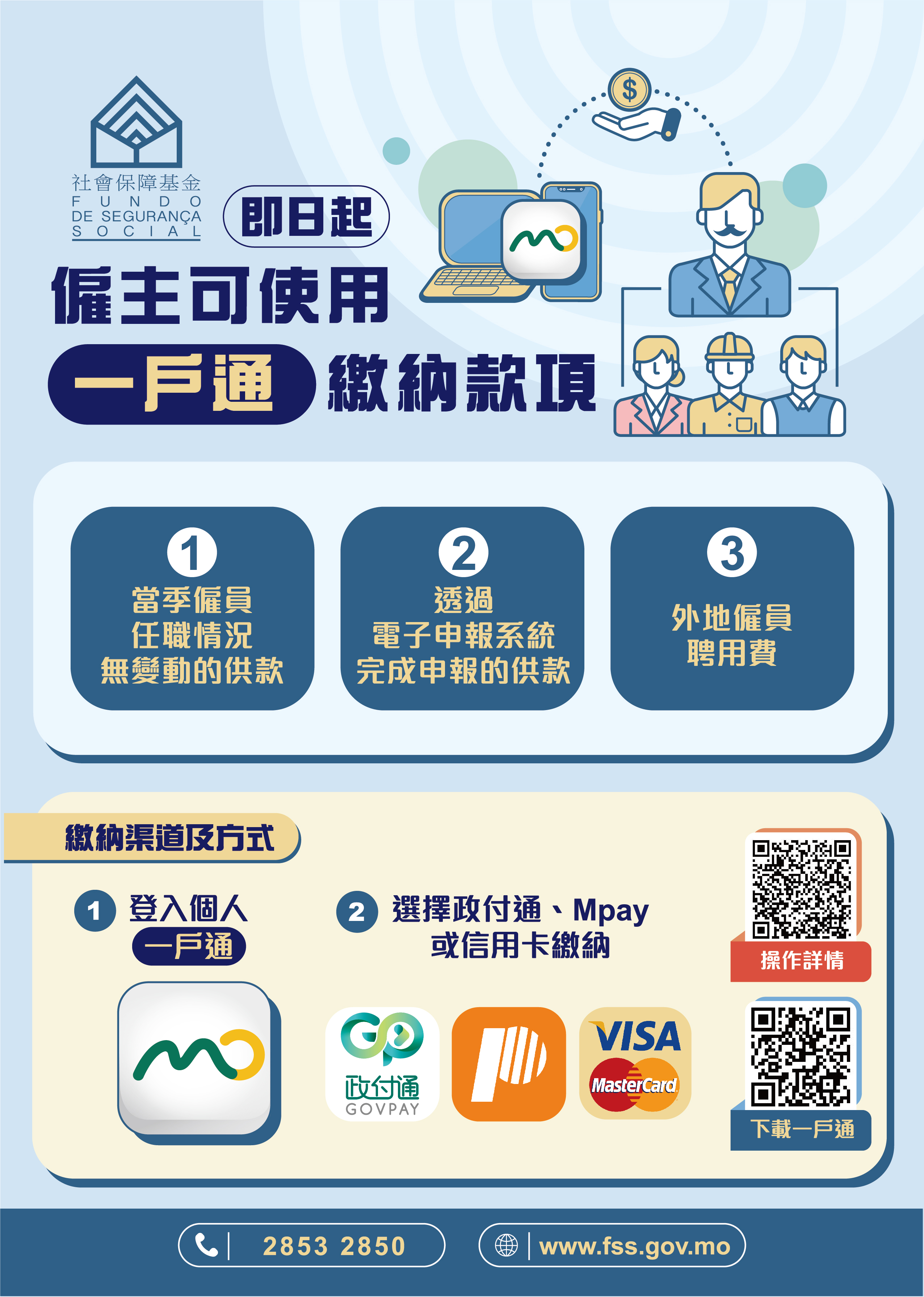 社會保障制度僱主繳款功能月初已於“一戶通”上線。僱員任職情況沒有變動或期限內已於電子申報系統完成僱員任職情況申報的僱主,可於月內透過“一戶通”或指定銀行的網上銀行等電子方式,繳納強制性供款和外地僱員聘用費,如有需要查詢憑單編號及應繳金額則可透過社保基金網上平台(eservice.fss.gov.mo/Employer/cpa/Index),全程無須親臨服務點或銀行,方便快捷。