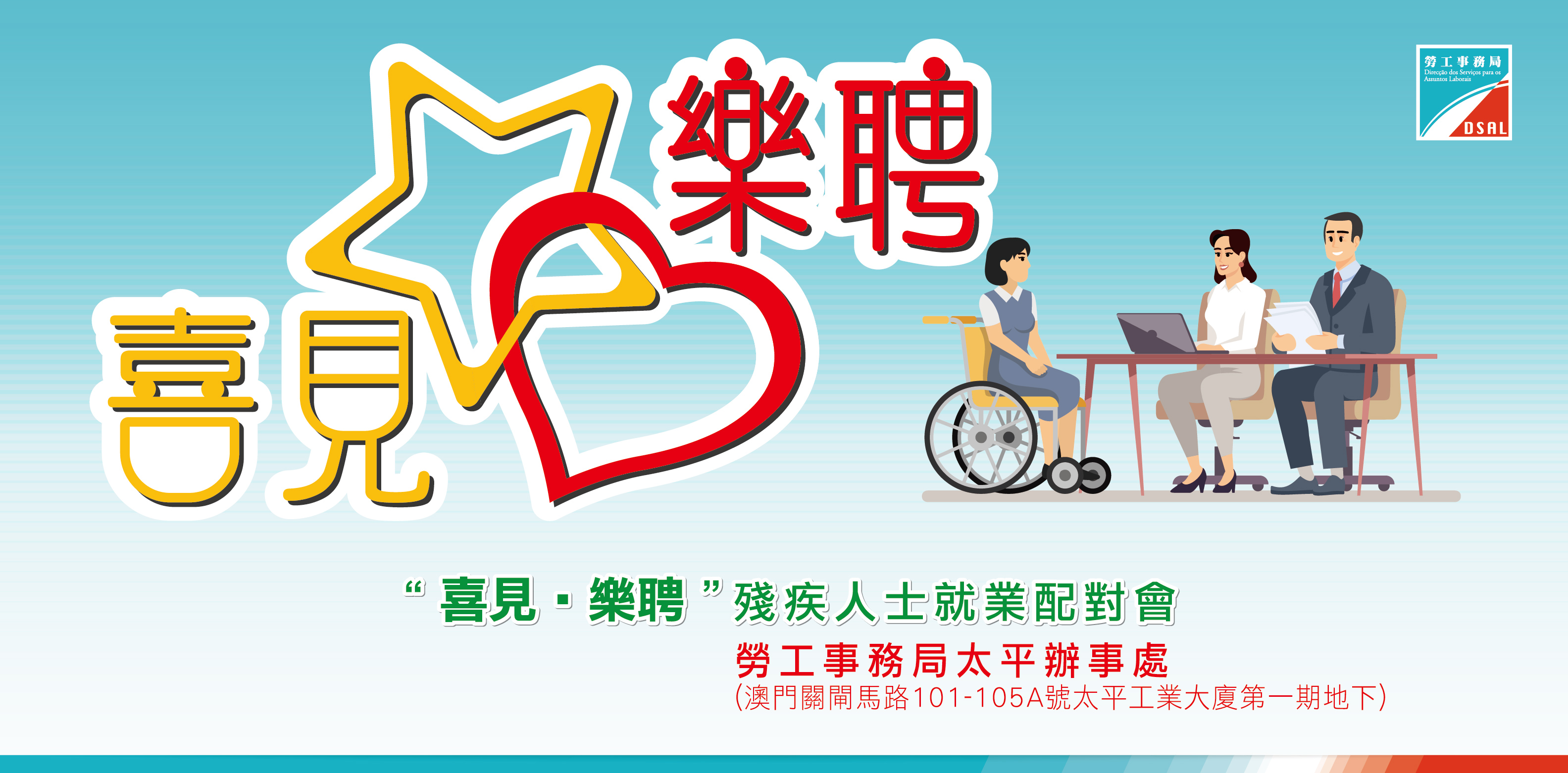 為推動僱主給予殘疾人士就業機會、鼓勵殘疾人士投入職場。勞工事務局將於本年6月20日在勞工局太平辦事處舉辦“喜見・樂聘”殘疾人士就業配對會。勞工局歡迎企業由4月24日起踴躍報名參與,支持殘疾人士就業。