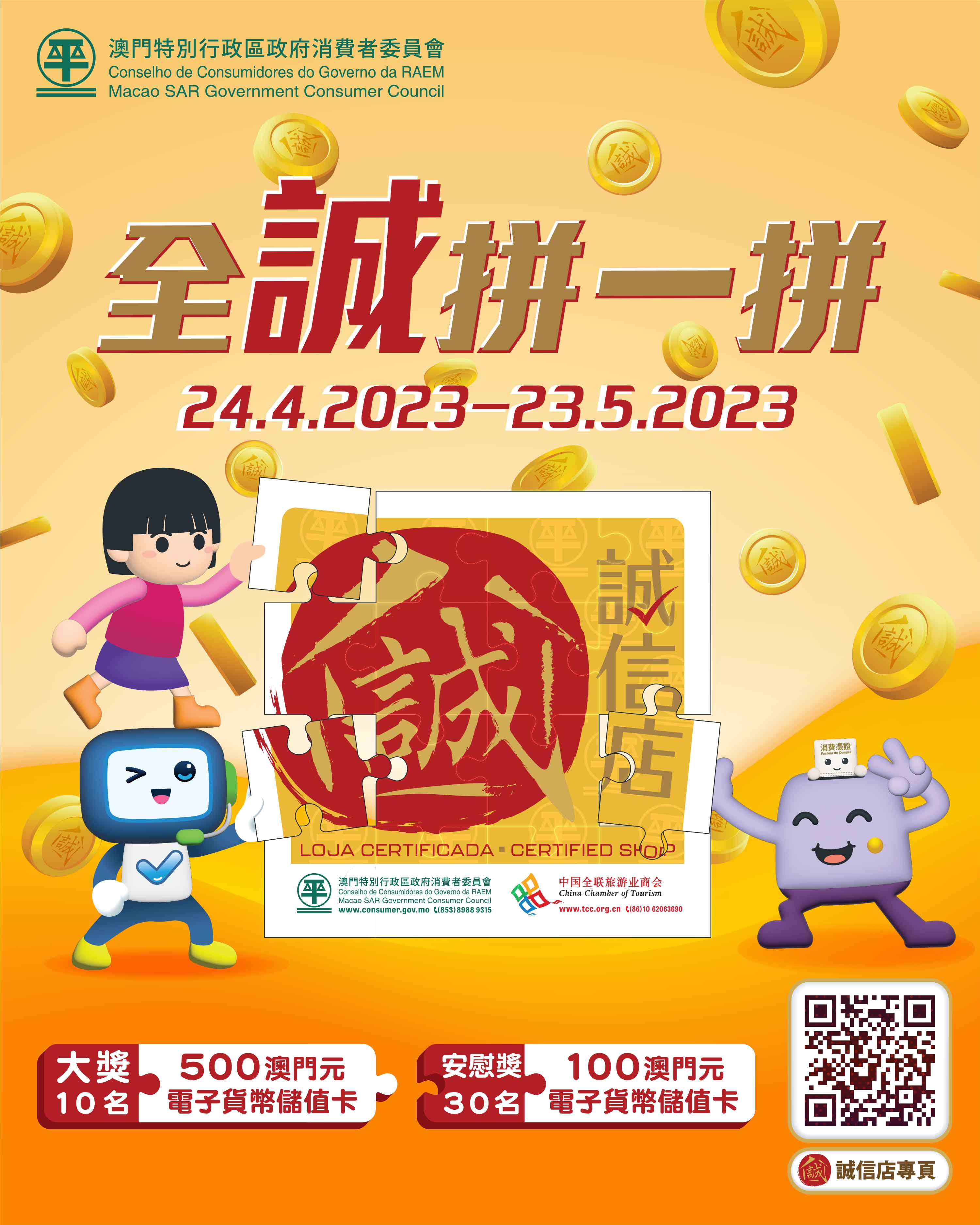 消費者委員會為加深消費者認識“誠信店”,舉辦網上拼圖有獎遊戲活動。活動由2023年4月24日開始至5月23日結束,歡迎澳門居民登入消委會網頁(www.consumer.gov.mo)的“全誠拼一拼”遊戲專頁,或掃描“誠信店”專頁二維碼參加遊戲,拼出正確的“誠信店”標誌即可登記抽獎。