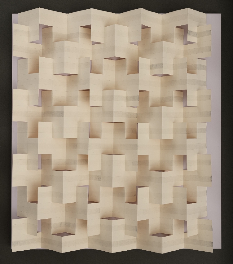 是次展覽“E42023”是梁飛燕過去幾年持續進行與發展的幾個項目的一次記錄與整理。《數學主題的網格結構》《白鷺源》《圍封現場》《語言的實相》等各個項目的出發點不同,有些以簡單而公式的方式來重覆書寫畫面,有些如段落句式,有些如絮語般展開,有些則透過摺疊與裁割等來進一步表現材質的特性。但無論是哪一個項目主題的作品,都可以發現不斷重複、井然有序背後的微小變化。正是這種微小變化使得作品在理性、硬朗的結構基調上展現出柔和與脆弱的特質。這種脆弱與不確定雖難捉摸,卻是梁飛燕在多年創作中想要捕捉的主體。