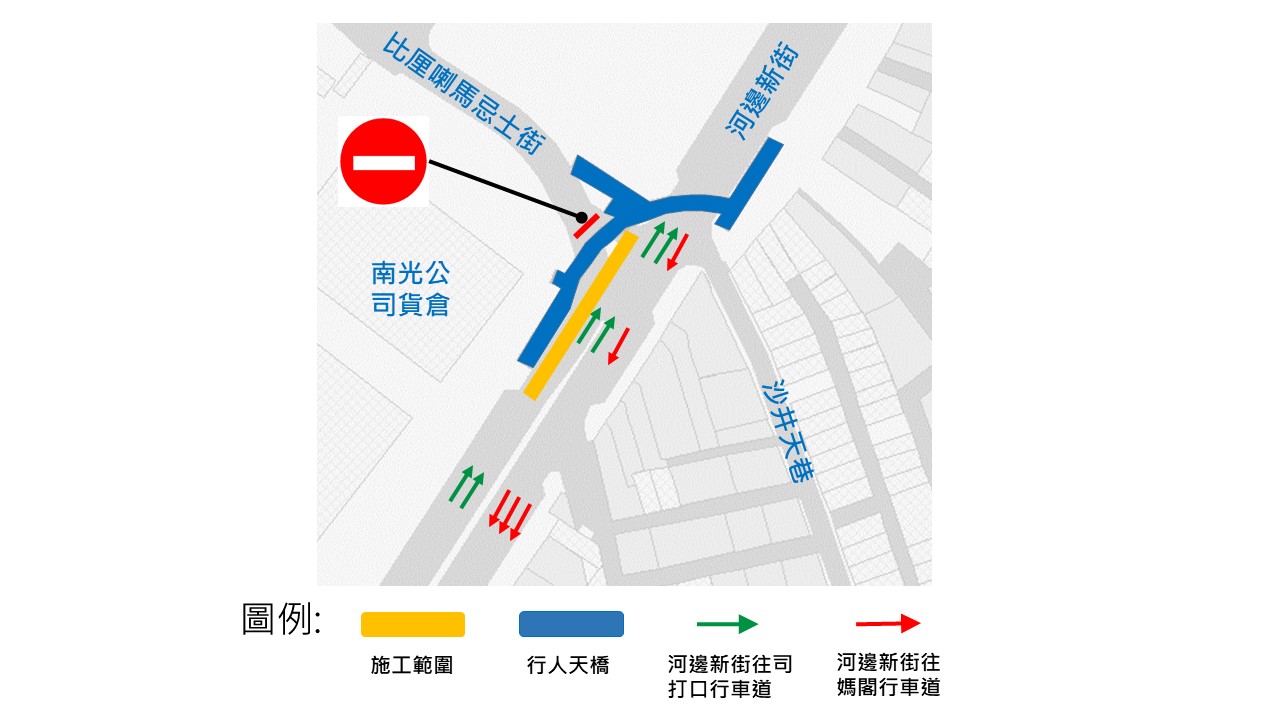內港南雨水泵站及下水道第二期工程將於5月4日展開河邊新街雨水箱涵施工,項目較早前已展開臨時拆除河邊新街中央綠化帶及部分行人道工作,以創造施工條件,減輕施工期間對周邊交通的影響。工程期間將維持現有行車方向,但近河邊新街行人天橋的一段車行道將收窄(詳見附圖),而介乎比厘喇馬忌士街與鹹魚街之間的一段巴士專道(往媽閣方向)亦會臨時停用。