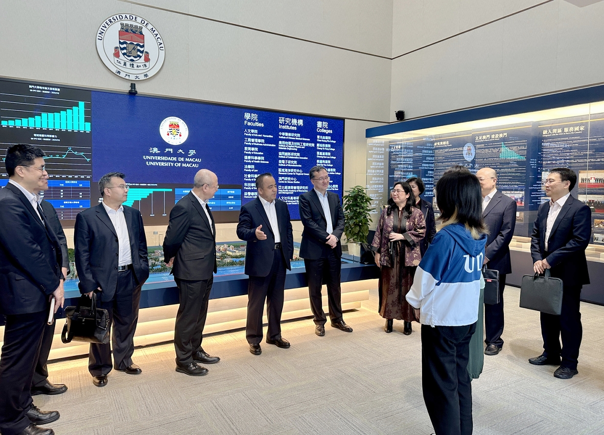 代表團首先參觀大學展館,許敬文向其介紹澳大的歷史沿革、學術架構、校園建設和發展方向,並表示澳大在中央和特區政府的支持下,將繼續發揮獨特的區域優勢,為師生提供優質的教學和科研環境,以進一步提升大學科技創新和人才培養的水平。