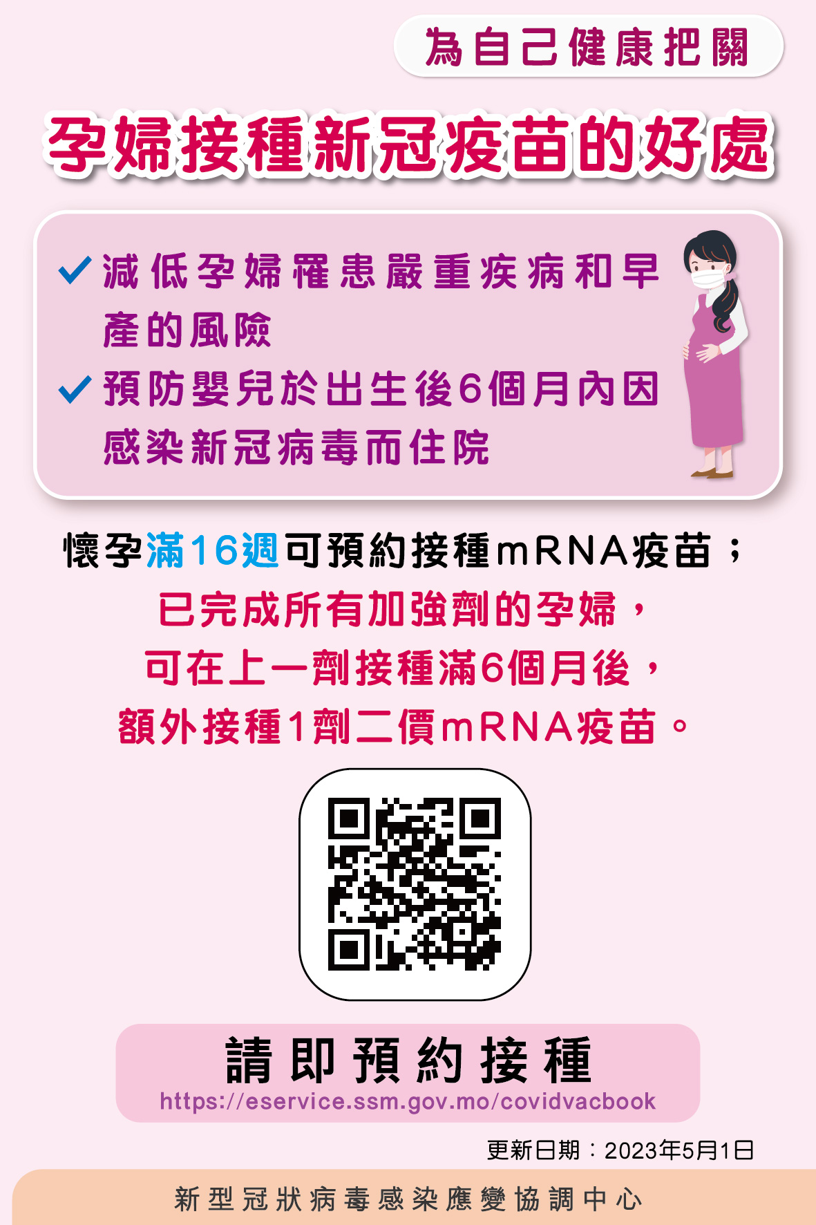 應變協調中心強烈呼籲所有人士,尤其孕婦、長者、患有慢性基礎病人士等高風險人群儘快完成新冠疫苗初種及加強劑接種,以減少感染新冠病毒後出現重症、住院和死亡的風險,並建議所有人士在接種加強劑時選用二價mRNA疫苗,以提高對Omicron變異株的保護效力。居民可登入 https://eservice.ssm.gov.mo/covidvacbook 預約接種。