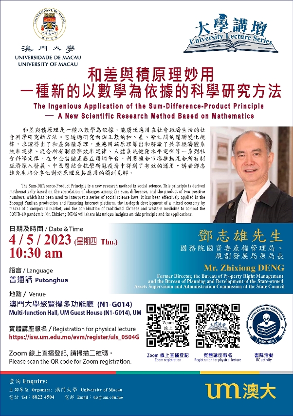 澳門大學將於5月4日舉辦“大學講壇”講座,由國務院國資委產權管理局、規劃發展局原局長鄧志雄擔任講者,就“和差與積原理妙用——一種新的以數學為依據的科學研究方法”為題發表演說。講座將線上線下同步舉行,歡迎有興趣人士參加。