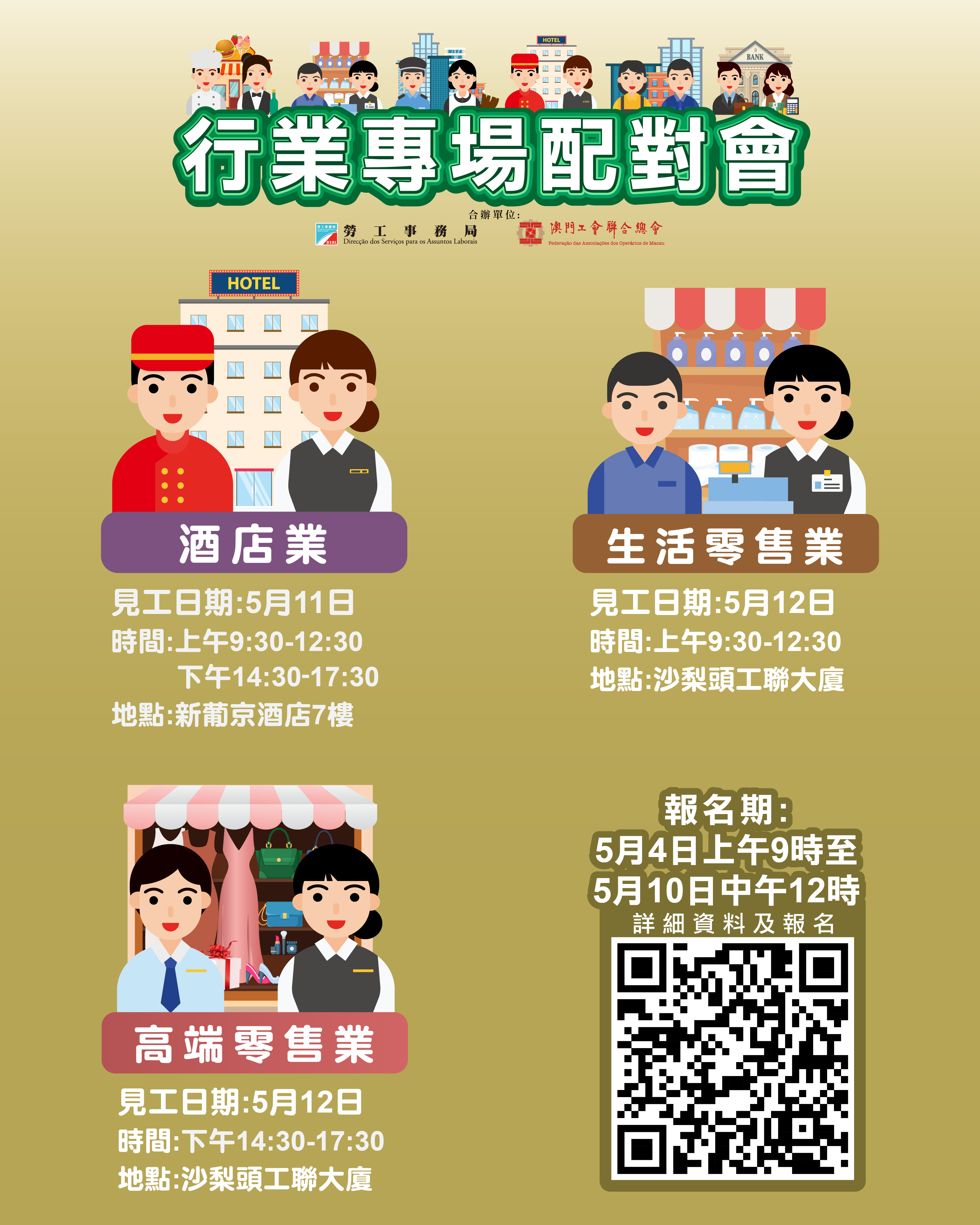 上述5月11日酒店業配對會在澳門新葡京酒店7樓舉行,5月12日上午的生活零售業配對會及下午的高端零售業配對會在澳門工會聯合總會(沙梨頭海邊街2-6號工聯大廈)舉行,報名日期為5月4日上午9時至5月10日中午12時。