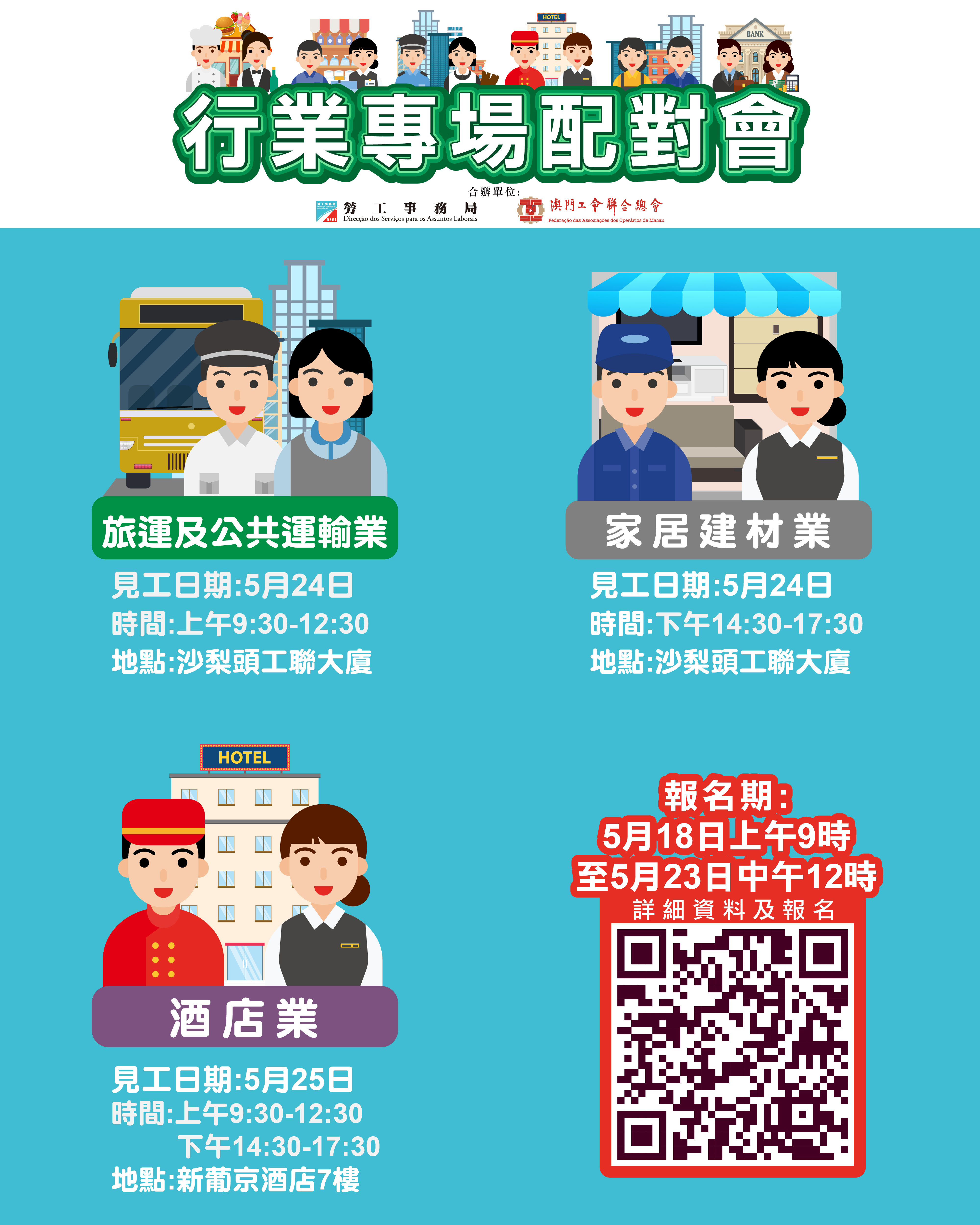 5月24日上午舉辦旅運及公共運輸業配對會,提供95個職位空缺,涉及車長、站長、車務員、站務員、客服員及清潔員。下午舉辦家居建材業配對會,提供206個職位空缺,涉及招商專員、營銷策劃專員、店務員、各類裝修工人及配送安裝工人等。上述配對會在澳門工會聯合總會(沙梨頭海邊街2-6號工聯大廈)舉行。