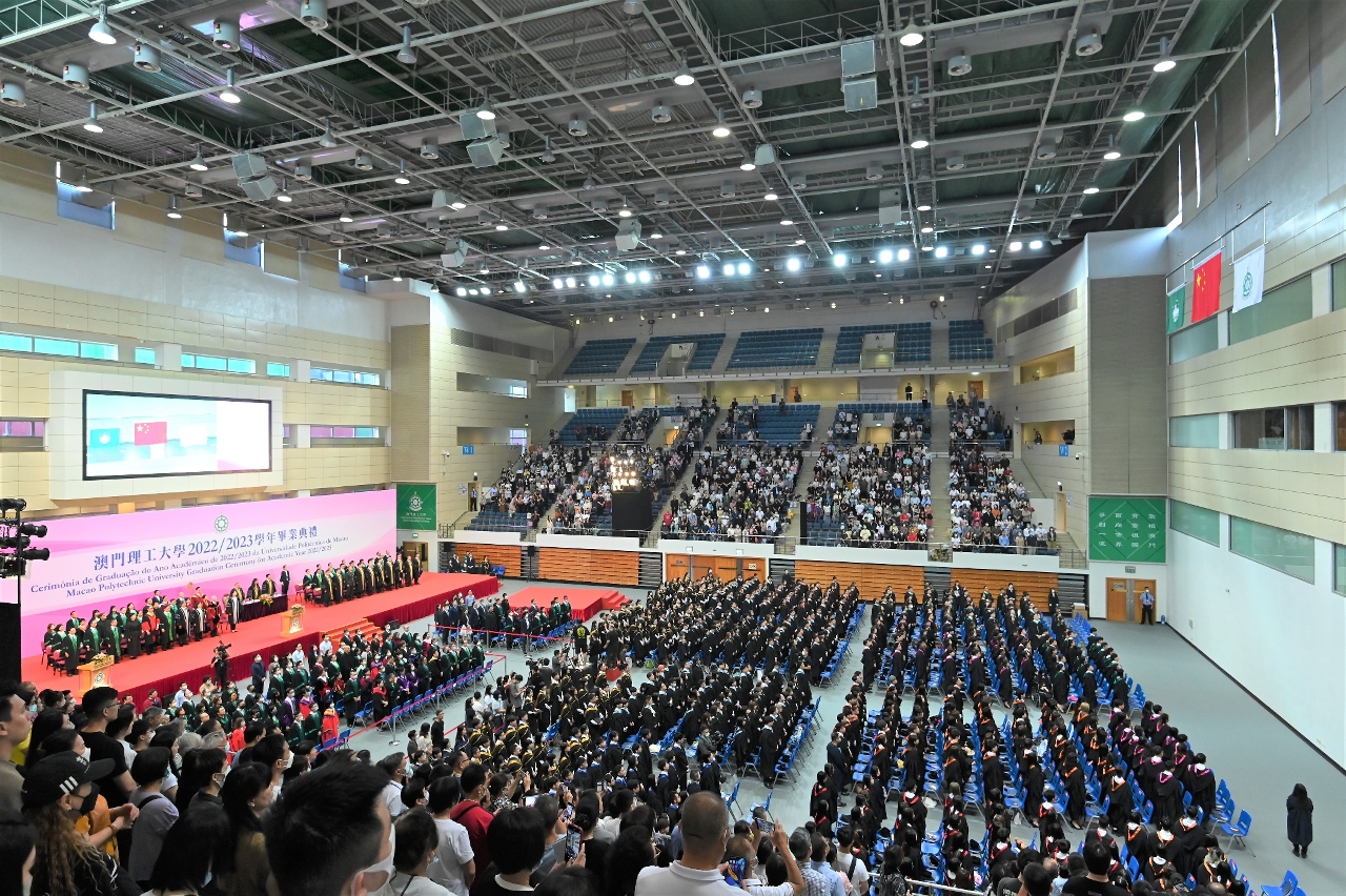澳門理工大學2022/2023學年畢業典禮由社會文化司司長歐陽瑜、中聯辦教育與青年工作部副部長石書正、外交公署新聞和公共外交部主任高原、中國人民解放軍駐澳門部隊副司令員戴勁松、澳理大校董會主席崔世昌、校長嚴肇基、教育及青年發展局代副局長黃健武等主禮,中學、獎學金捐贈機構、社會各界、畢業生及親友三千多人出席,場面熱鬧。