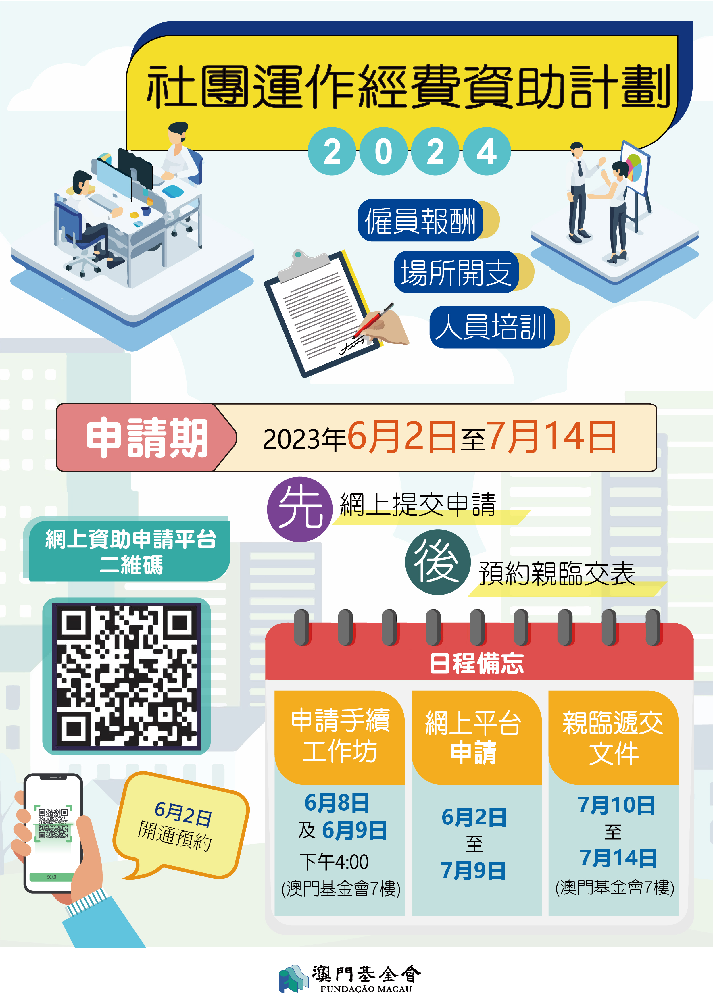 澳門基金會2024年度四個資助計劃將於本年6月至9月期間接受申請,其中“社團運作經費資助計劃”申請期由即日起至7月14日,“學術項目”、“社區活動”及“交流活動”三個資助計劃申請期為8月1日至9月15日。