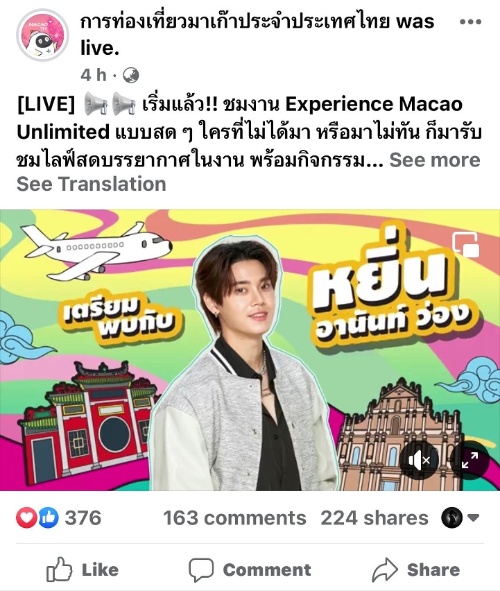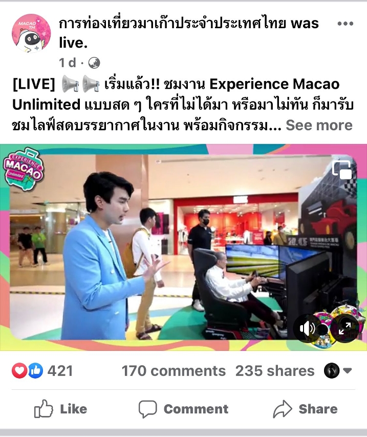 此外,旅遊局積極在官方抖音、臉書及Instagram各平台宣傳,泰國當地超過70間媒體亦配合活動進行推廣,旅遊局官方臉書也在路展開幕當天直播現場盛況,通過多元宣傳方式推介澳門作為首選旅遊目的地,目前相關宣傳曝光量達100萬。