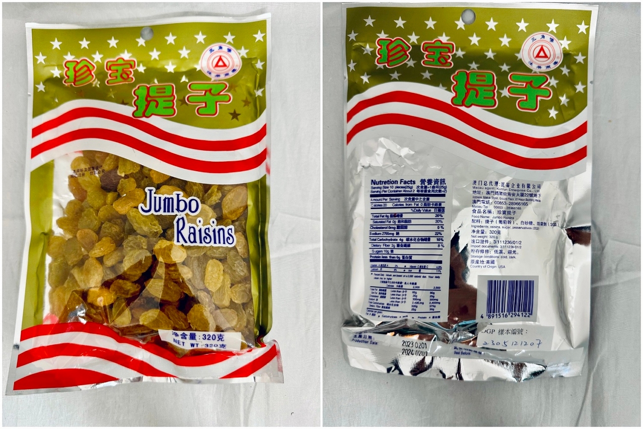 未能通過檢測的預包裝乾製水果,產品牌子為“三角嘜”,產品名稱為“珍寶提子 Jumbo Raisins”,原產地為美國,淨重320克,生產日期:2023.02.01,此日期前最佳:2024.02.01。該產品被驗出每公斤含3180毫克的二氧化硫,超出本澳第7/2019號行政法規《食品中防腐劑及抗氧化劑使用標準》的規定。市政署已即時跟進,勒令涉事商戶停售及回收有關問題產品。