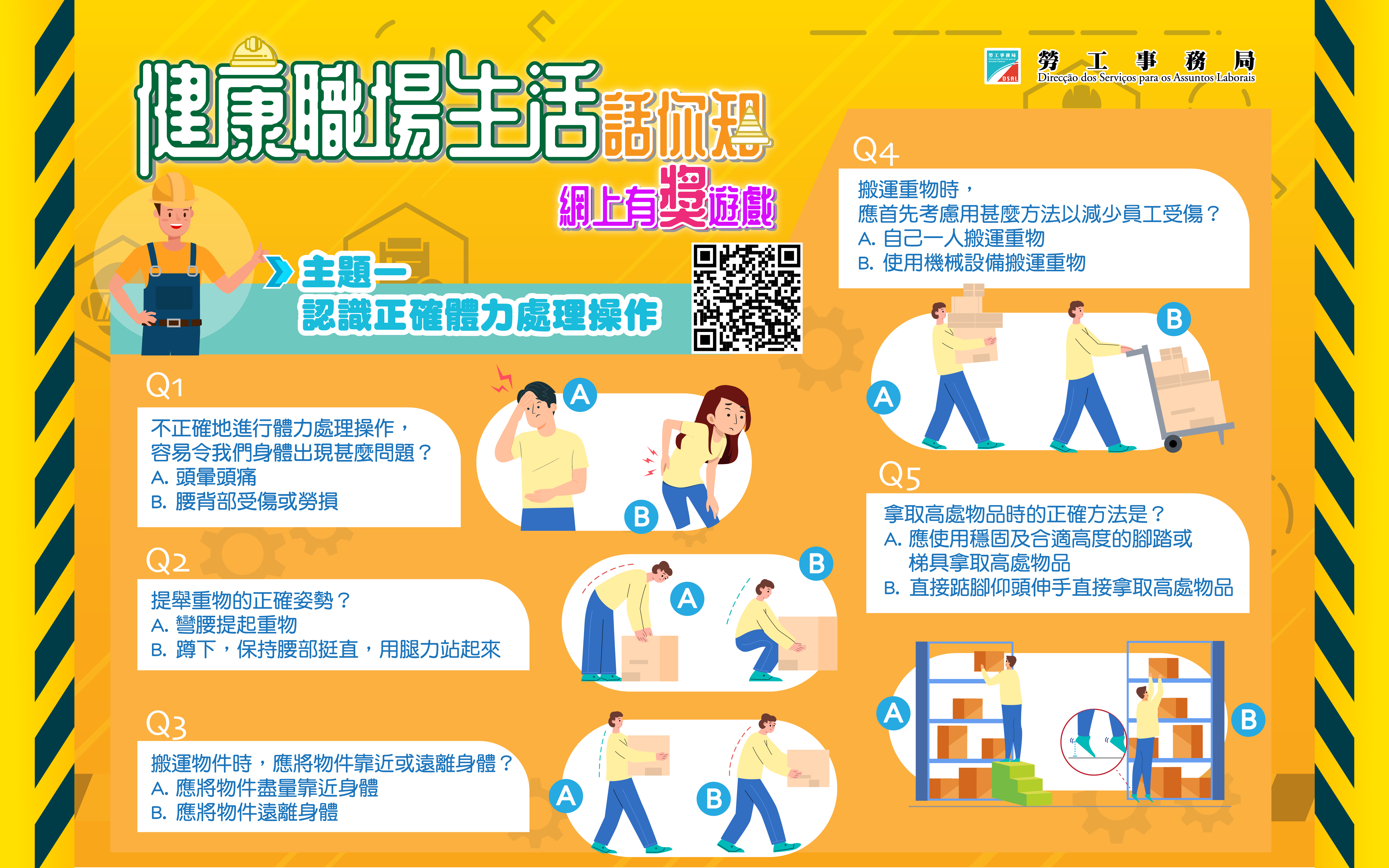 有獎遊戲由6月12日起至11月期間分四期推出。第一至四期的主題分別是“認識正確體力處理操作”、“認識職業性上肢肌肉筋骨勞損”、“安全使用化學品”及“認識個人防護裝備”,從不同方面向巿民介紹相關職業健康知識。