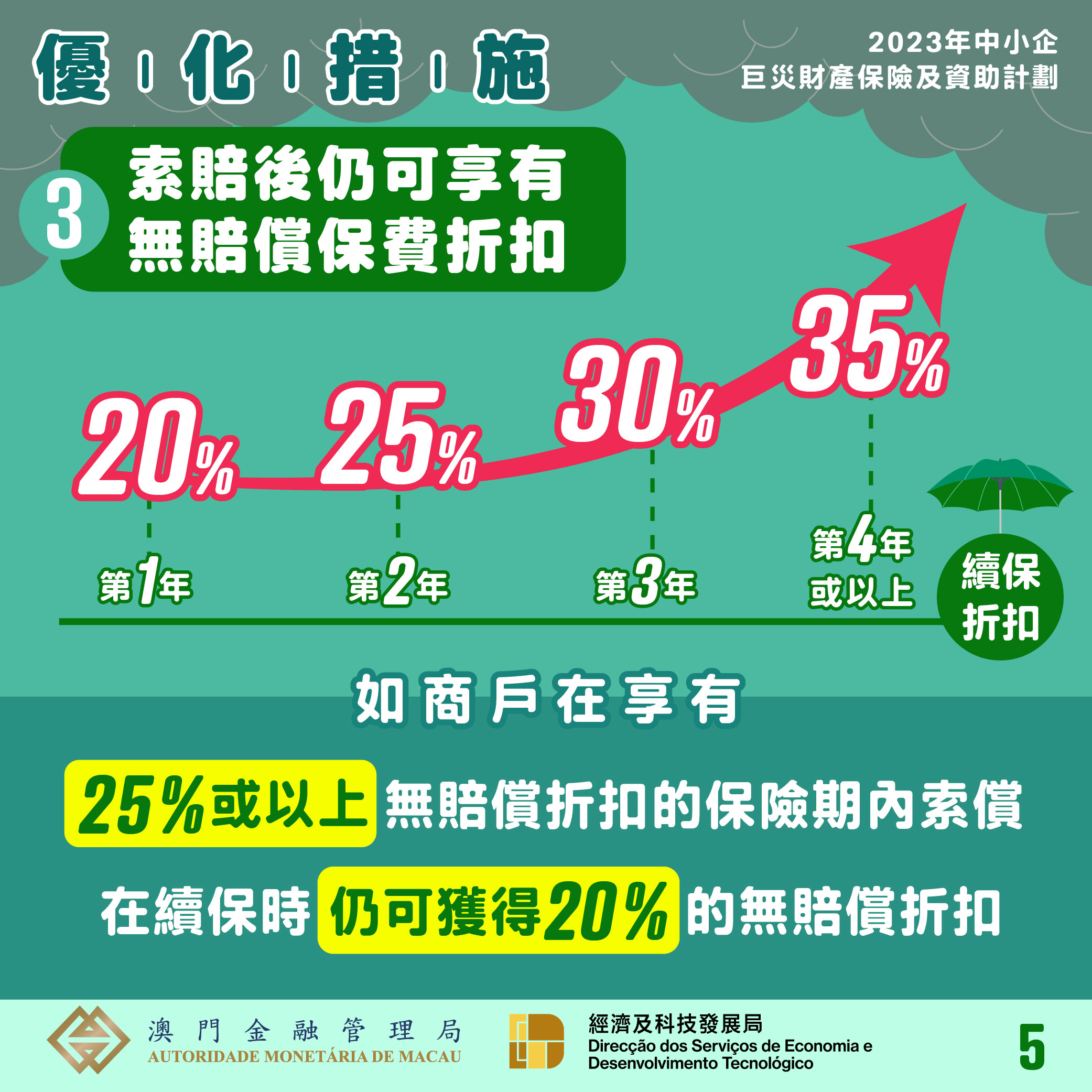 未曾索賠的商戶今年繼續享有保費折扣,第一年續保有20%的折扣優惠,第二年為25%、第三年為30%、第四年或以上為35%。此外,由今年起,如商戶在享受25%或以上無賠償折扣的保險期內曾作出索償,於翌年續保時,仍可獲得20%的保費折扣優惠,往後續保時如無索償記錄,再逐年疊加折扣至35%。