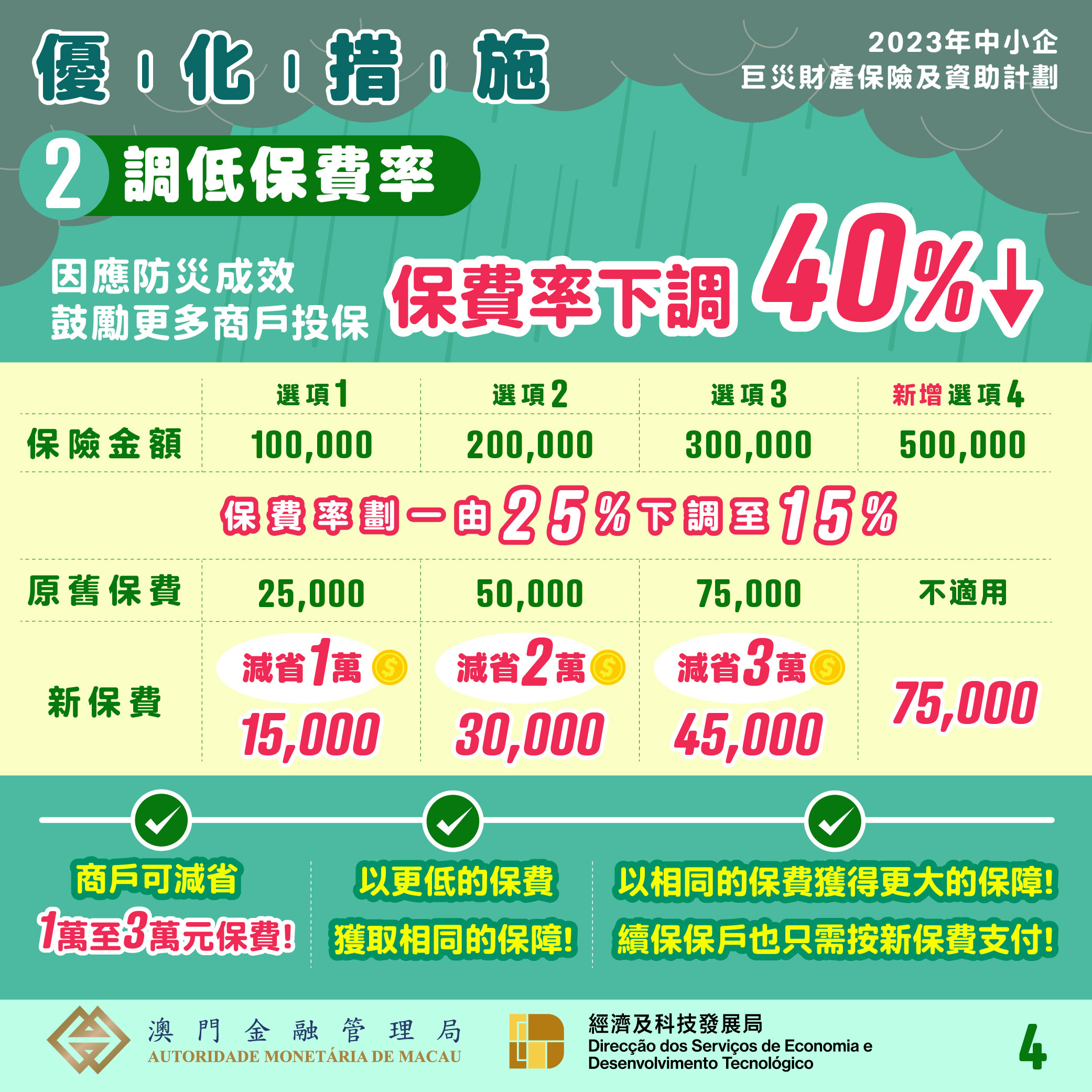 為鼓勵商戶透過商業保險轉移風險,澳門金融管理局聯動保險業界,再次優化中小企巨災財產保險(下稱“巨災保險”)的安排,支持中小企加強保險保障以應對極端氣候風險。2023年度巨災保險的優化安排包括增加保額為50萬澳門元的投保選項,保費率下調四成至15%,以及對特定曾索賠商戶提供一定的續保折扣優惠。同時,工商業發展基金將繼續推出中小企巨災財產保險資助計劃(下稱“資助計劃”),紓緩商戶經濟負擔。