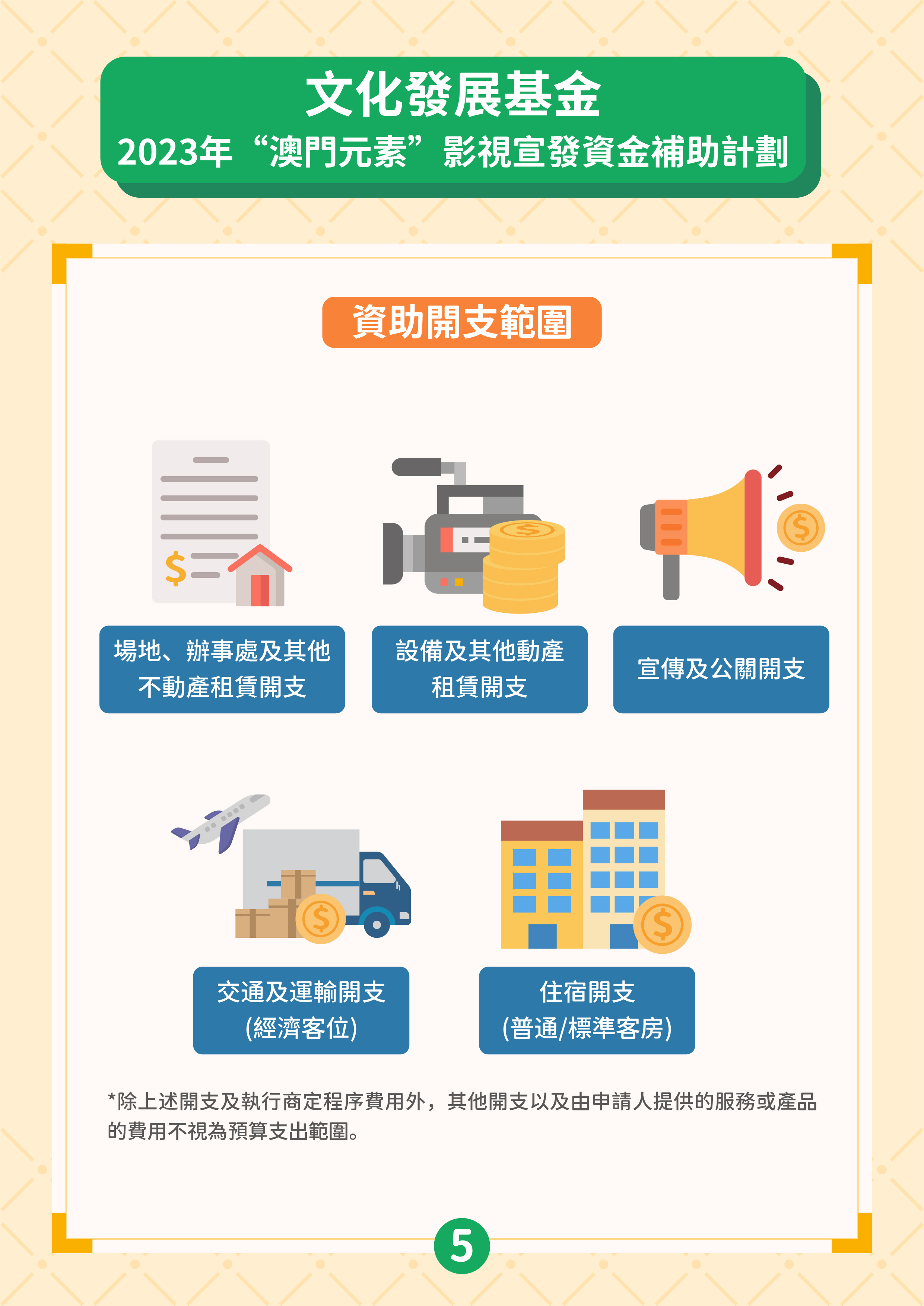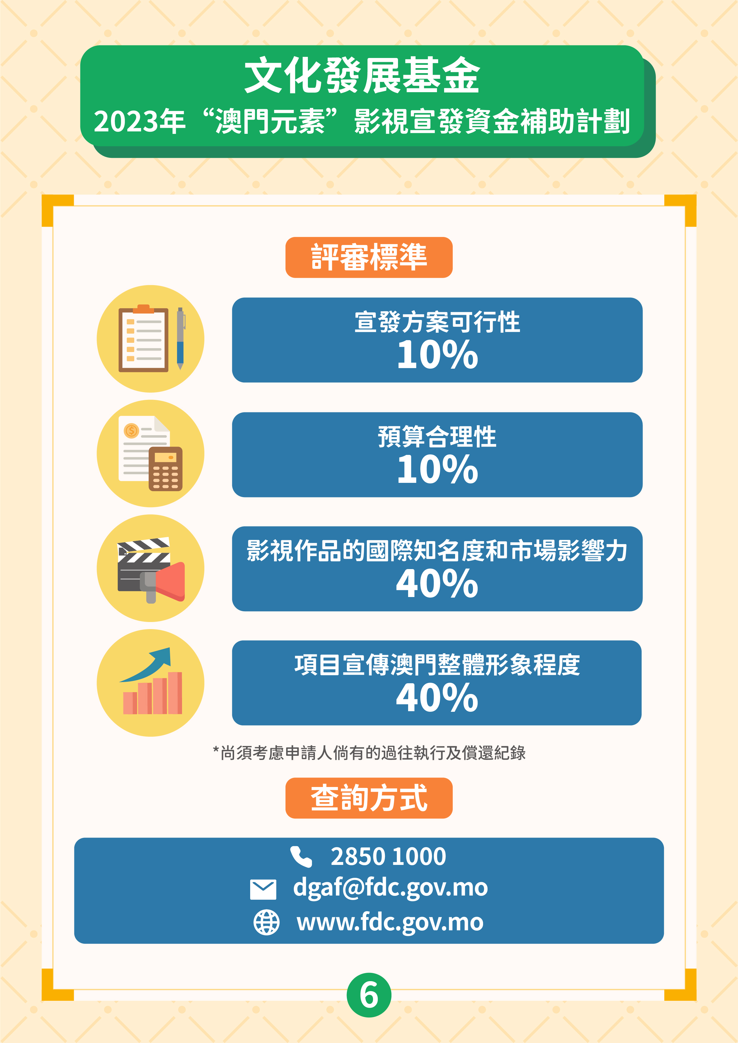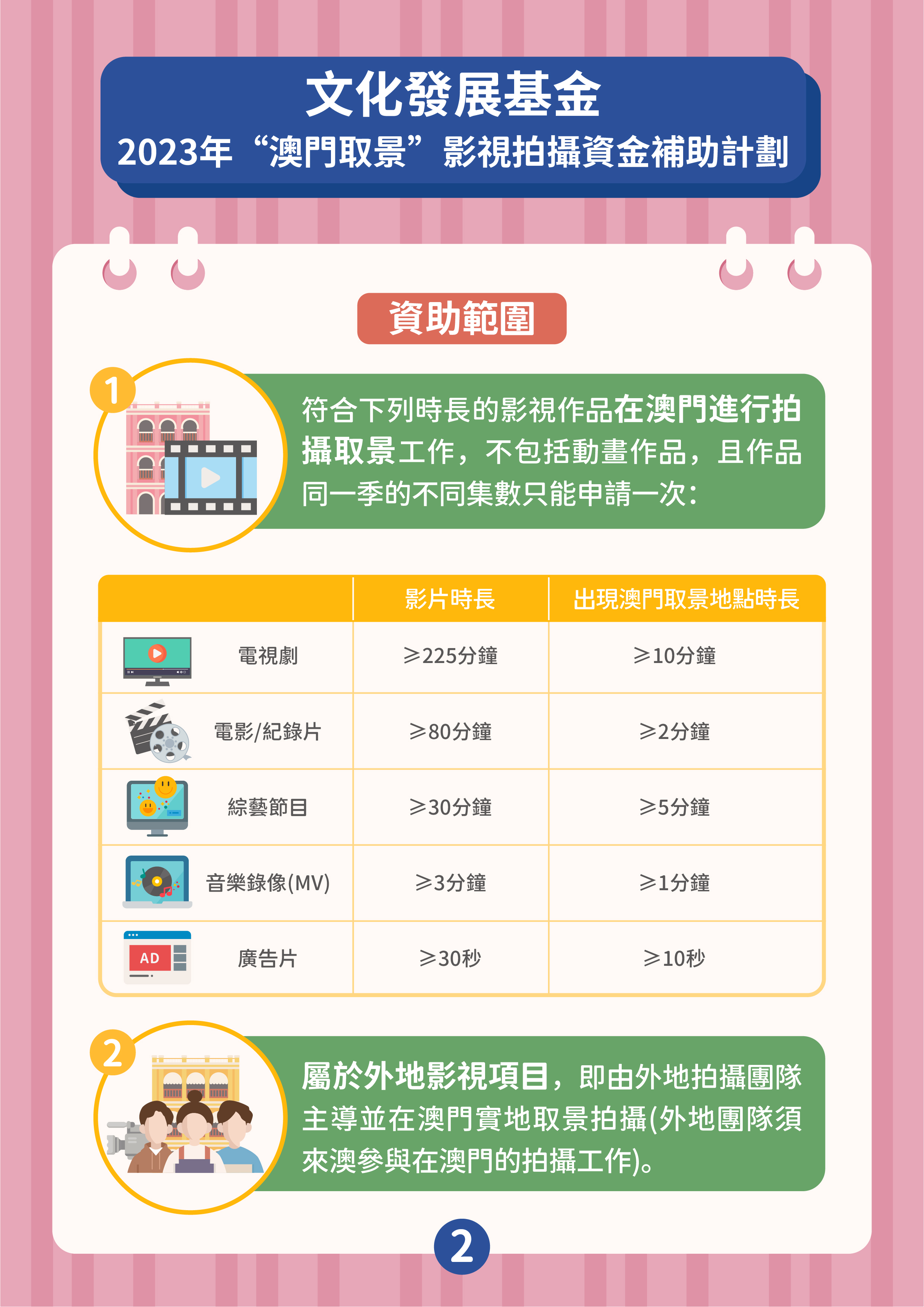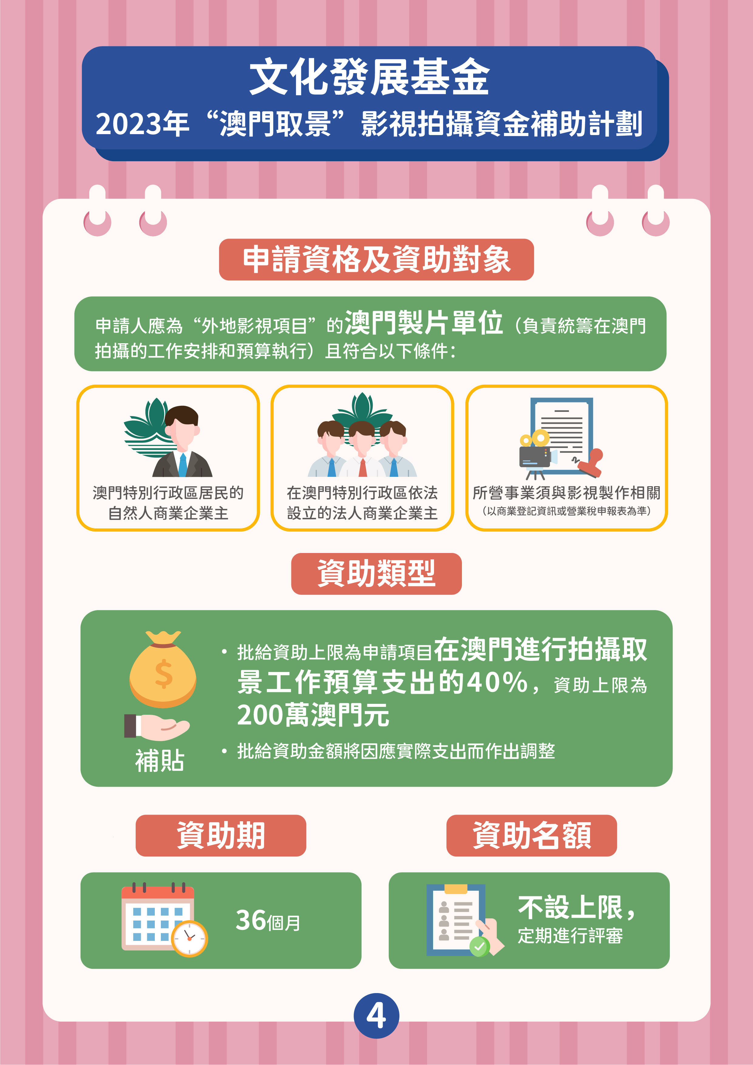 “澳門取景"影視拍攝資金補助計劃的目的是吸引境外拍攝團隊到澳門取景,通過影視作品宣傳推廣澳門形象,提升澳門的國際知名度,並為本地影視企業提供更多參與拍攝外地影視作品的機會。資助計劃接受在申請期開始(2023年6月21日)前、尚未在澳門取景拍攝且在澳拍攝的日數不少於3天的外地影視項目,由外地拍攝團隊主導並來澳參與拍攝工作。資助申請須由作為澳門製片單位的商業企業主提出。獲資助的影視項目須在資助期內完成公開播放,公映版本的片長及片中出現澳門取景點的時長,須符合章程規定的時限要求。批給資助上限為申請項目在澳門進行拍攝取景工作預算支出的40%,上限為200萬澳門元。