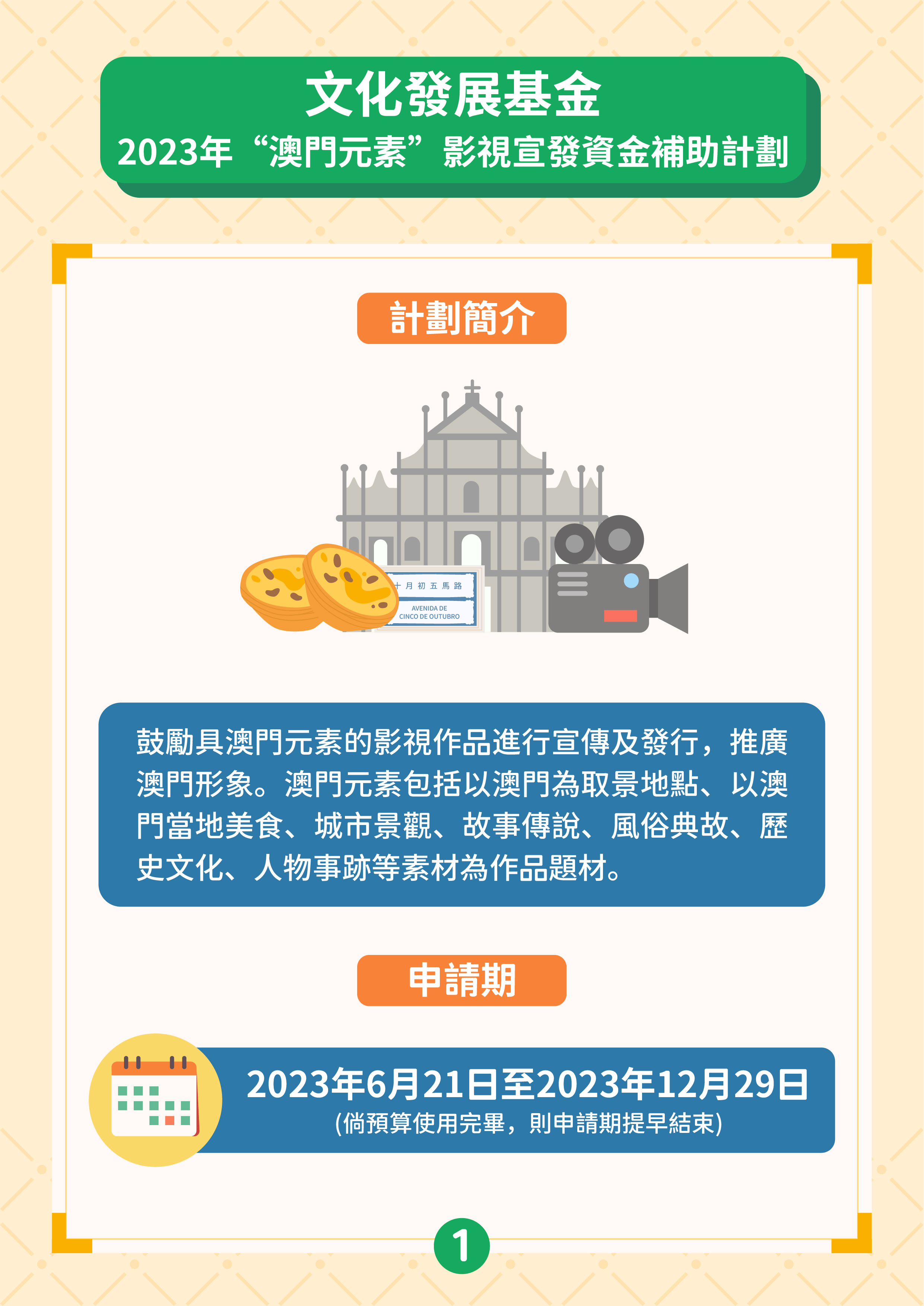 文化發展基金推出“澳門元素”影視宣發資金補助計劃、“澳門取景"影視拍攝資金補助計劃,支持具澳門元素影視作品投入市場,加強宣傳澳門城市形象及提升國際知名度,帶動文創及旅遊的聯動性,推動澳門影視產業發展。