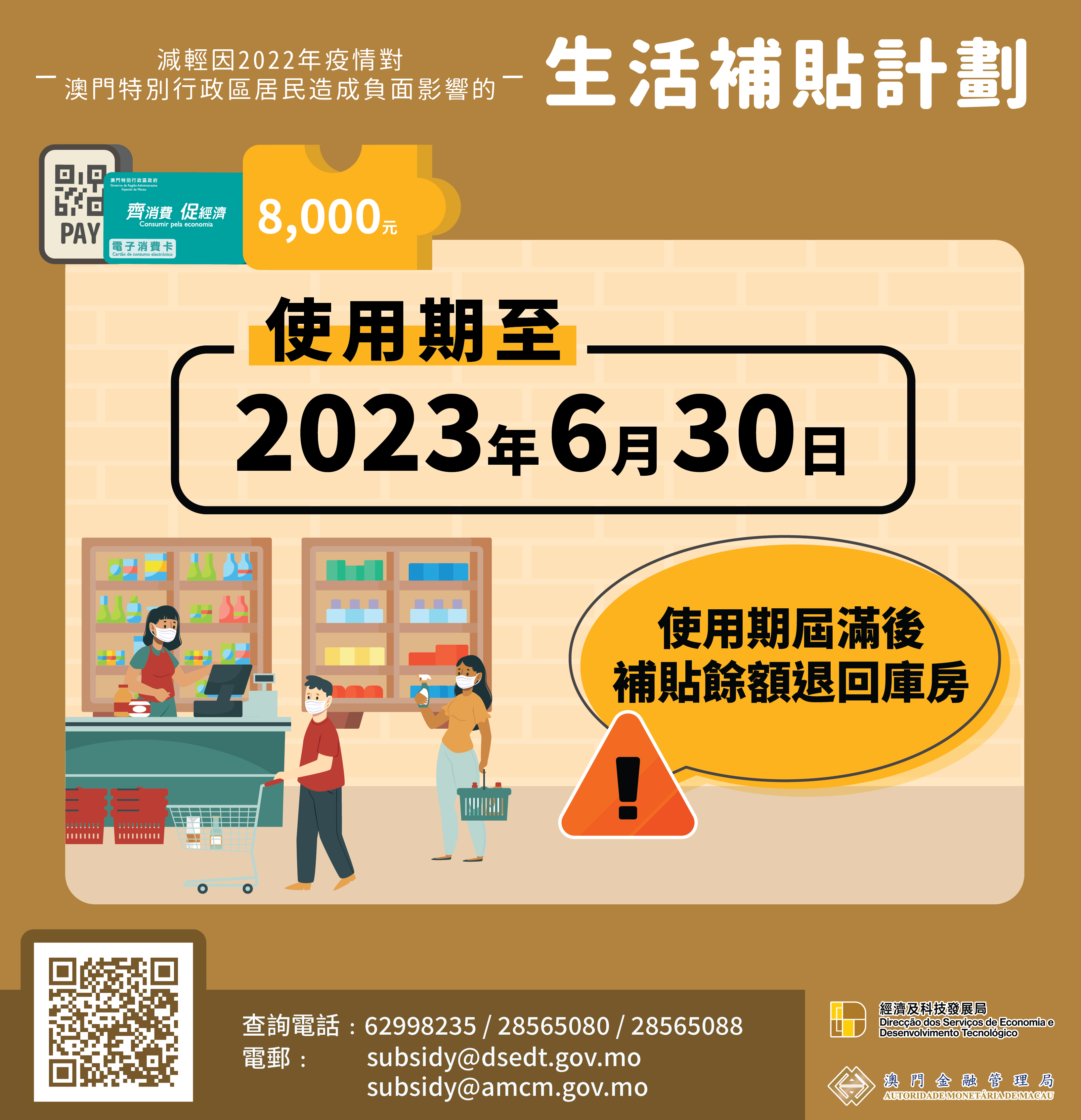 “生活補貼”的使用期將於2023年6月30日結束,特區政府呼籲已領取生活補貼的居民及時使用,逾期未使用的補貼將會退回庫房。
