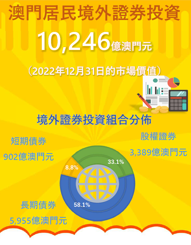 澳門金融管理局今天發佈的統計顯示,在2022年12月31日,澳門居民(包括個人、政府及其他法人,但不含澳門特別行政區的外匯儲備)持有由境外無關連實體發行的證券投資,以當天市場價值計算為10,246億元(澳門元,下同),與2022年6月30日及2021年底比較,分別錄得1.8%的升幅和6.7%的跌幅。在各類證券投資中,股權證券(包括互惠基金與投資信託單位)、長期債券及短期債券的市值分別為3,389億元、5,955億元及902億元。與2021年底比較,股權證券和長期債券的市值分別下跌12.9%和8.0%,而短期債券的市值則上升46.6%。
