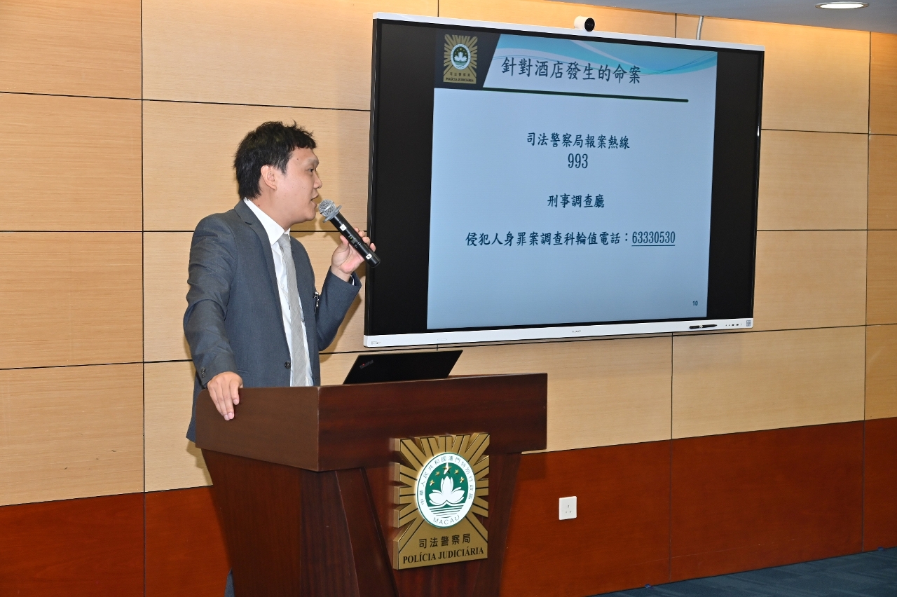 因應今年來澳旅客急增,各旅遊景點及酒店設施人流暢旺,與旅遊博彩行業相關的違法犯罪情況有所回升,司法警察局舉行“酒店業界治安通報機制”交流會暨防罪滅罪嘉許儀式,與業界代表就持續優化現有通報機制、提升前線從業員的防罪意識和能力、加強警民合作防範罪案等議題進行探討交流。會上,司警局向積極協助執法工作的5間酒店頒發嘉許狀。