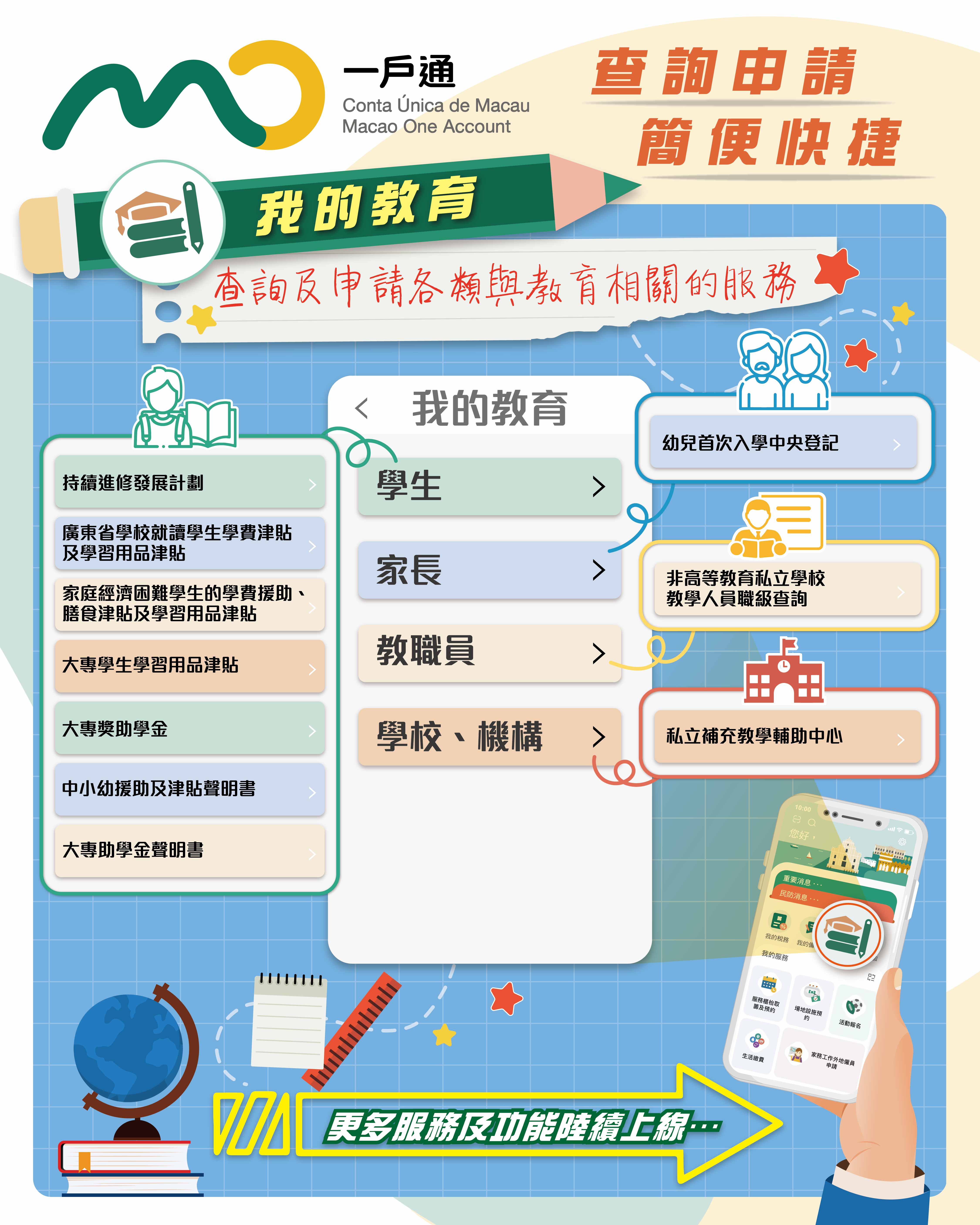 在使用“我的教育”前需更新“一戶通”手機應用程式最新版本。公眾如欲了解更多資訊,請瀏覽“一戶通”專題網站(https://www.gov.mo/app/),查看宣傳圖文包及短片。