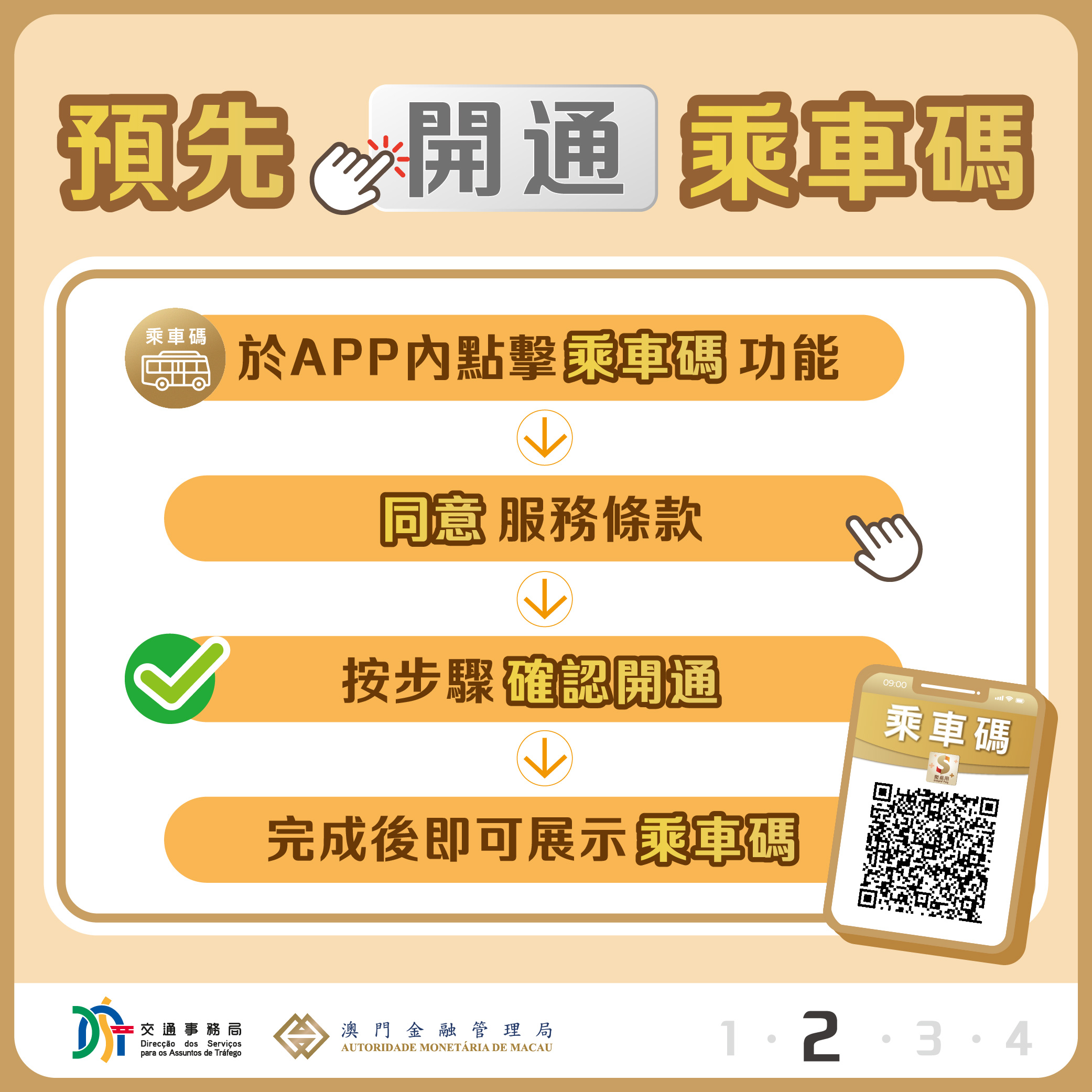 為便利乘客使用乘車碼,交通事務局已於“巴士報站”APP內,加入跳轉至“乘車碼”頁面的功能;乘客在完成支付車資後24小時內,亦可透過支付工具APP連結至交通事務局填寫問卷,以表達對巴士服務的意見。