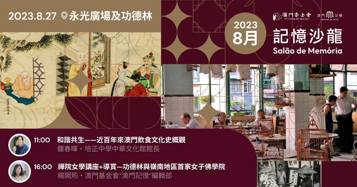 即將舉行的8月份兩場講座,分別邀請到澳門培正中學中華文化館館長鍾春暉博士主講“和諧共生──近百年來澳門飲食文化史概觀”及澳門基金會“澳門記憶”編輯部楊開荊博士主講“禪院女學——功德林與嶺南地區首家女子佛學院”。其中的功德林主題講座部分,當中的《澳門功德林寺院檔案文獻(1645-1980年)》於2023年5月成功申報聯合國教科文組織(UNESCO)《世界記憶(國際)名錄》,而本次講座得到功德林寺院院方的大力支持,能於院內舉行並進行導賞,機會千載難逢,萬勿錯過。