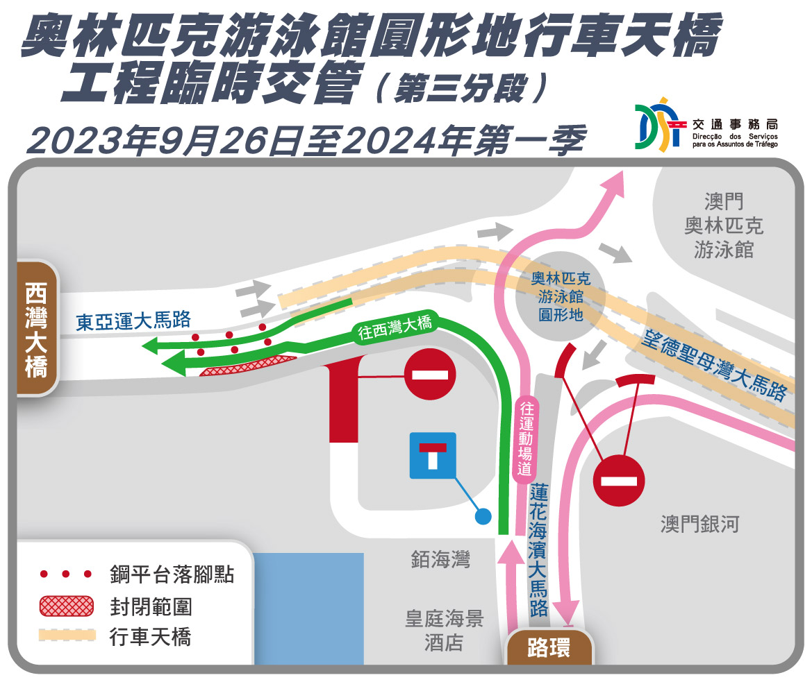 配合奧林匹克游泳館圓形地行車天橋西南匝道橋建造工程推進,由2023年9月2日至25日需要於東亞運大馬路往西灣大橋方向之行車天橋出口搭建臨時鋼平台以便進行橋面結構施工,整體工程預計於2024年第一季完工,上述期間,東亞運大馬路往西灣大橋方向的部份路段分段實施有限度通車;而奧林匹克游泳館圓形地的臨時交通措施和巴士臨時調整繼續維持現有安排,直至鋼平台拆卸工作完成後將恢復原有安排。
