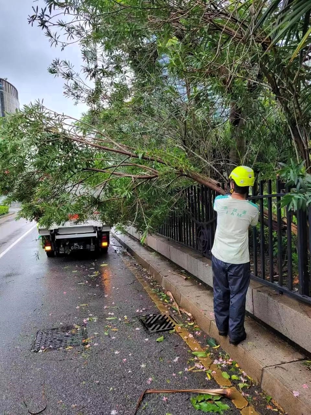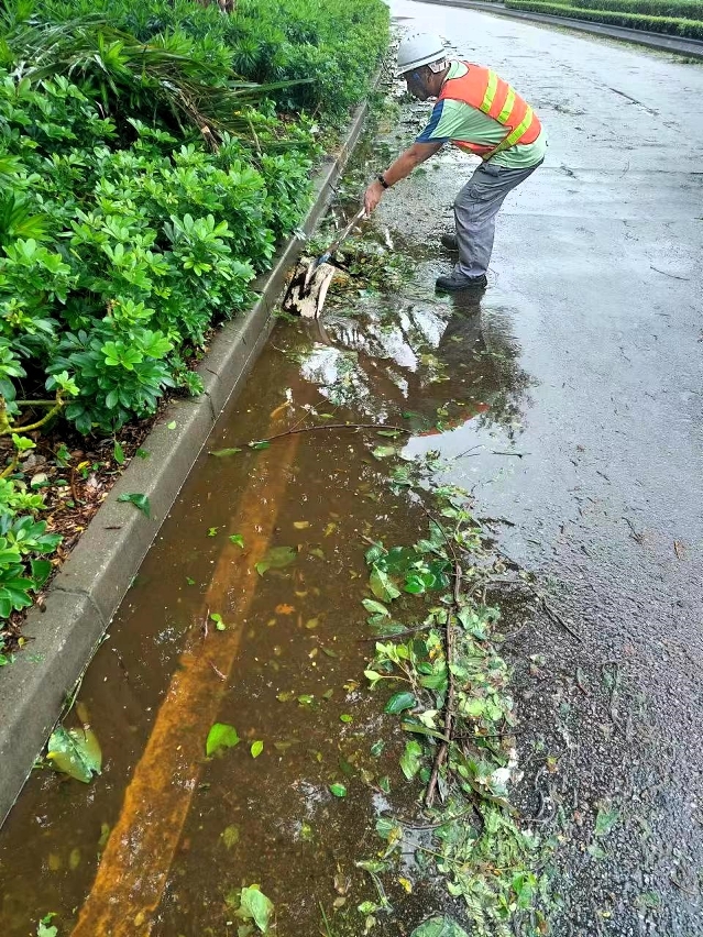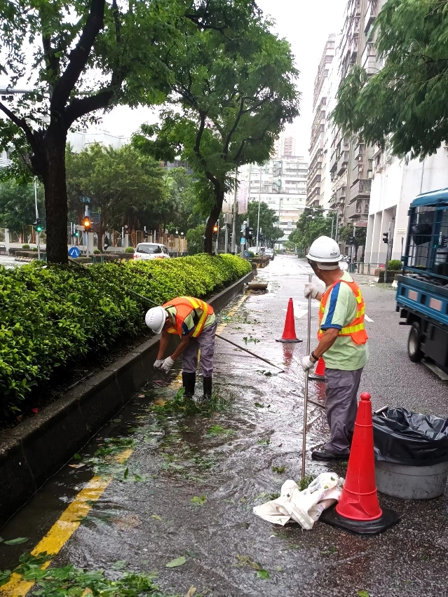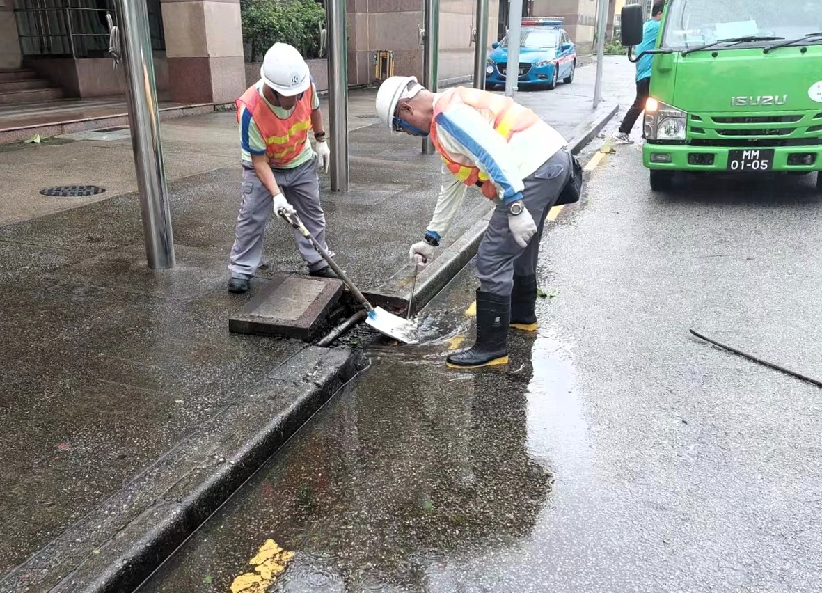 市政署人員於改掛八號風球時,已加緊派員清理行車路面上倒塌樹木及斷枝,首要開通本澳各主要幹道的交通,以便救援工作順利進行;同時市政署人員亦正持續檢查各泵房及渠道的運作,以及即時疏通受垃圾堵塞之雨水井,以確保積水能有效排走,盡快舒緩水浸的情況。