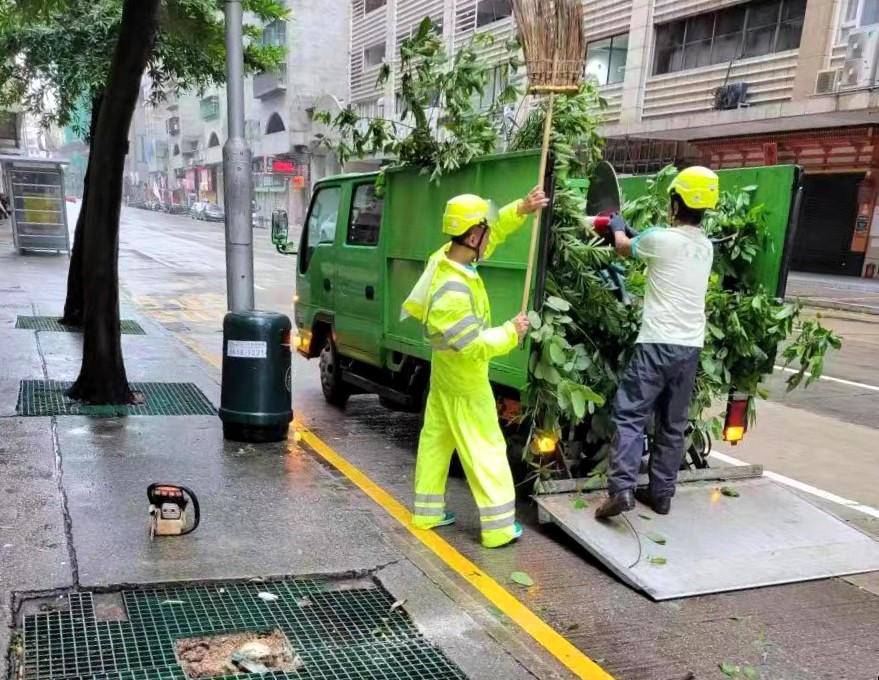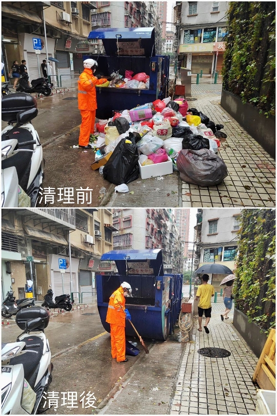 同時,市政署協調澳門清潔專營有限公司調動所有人力,日、夜間合共出動增加垃圾車輛至32架(平日21架),並延長工作時間,以加快清運各區垃圾,盡快回復市面衛生情況。市政署呼籲市民不要將垃圾隨便棄置在街道上,應先棄置易腐壞的垃圾,須包好放入公共垃圾收集設施,而高層大廈的管理實體亦應配合將垃圾桶有序推放到公共街道待收,並須保持周邊環境衛生,讓澳門清潔專營有限公司能集中清運,加快災後恢復工作。。