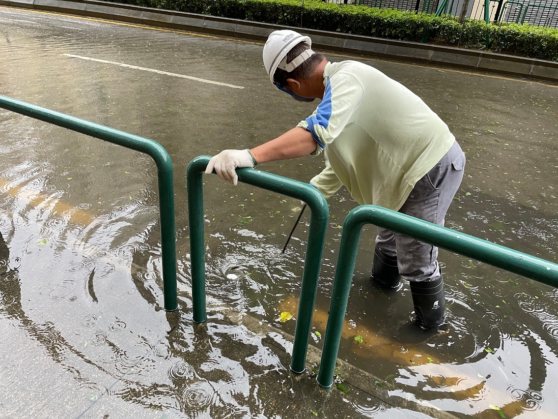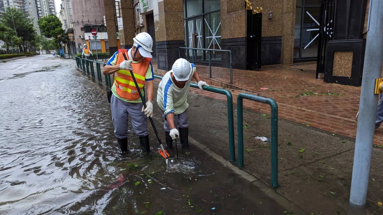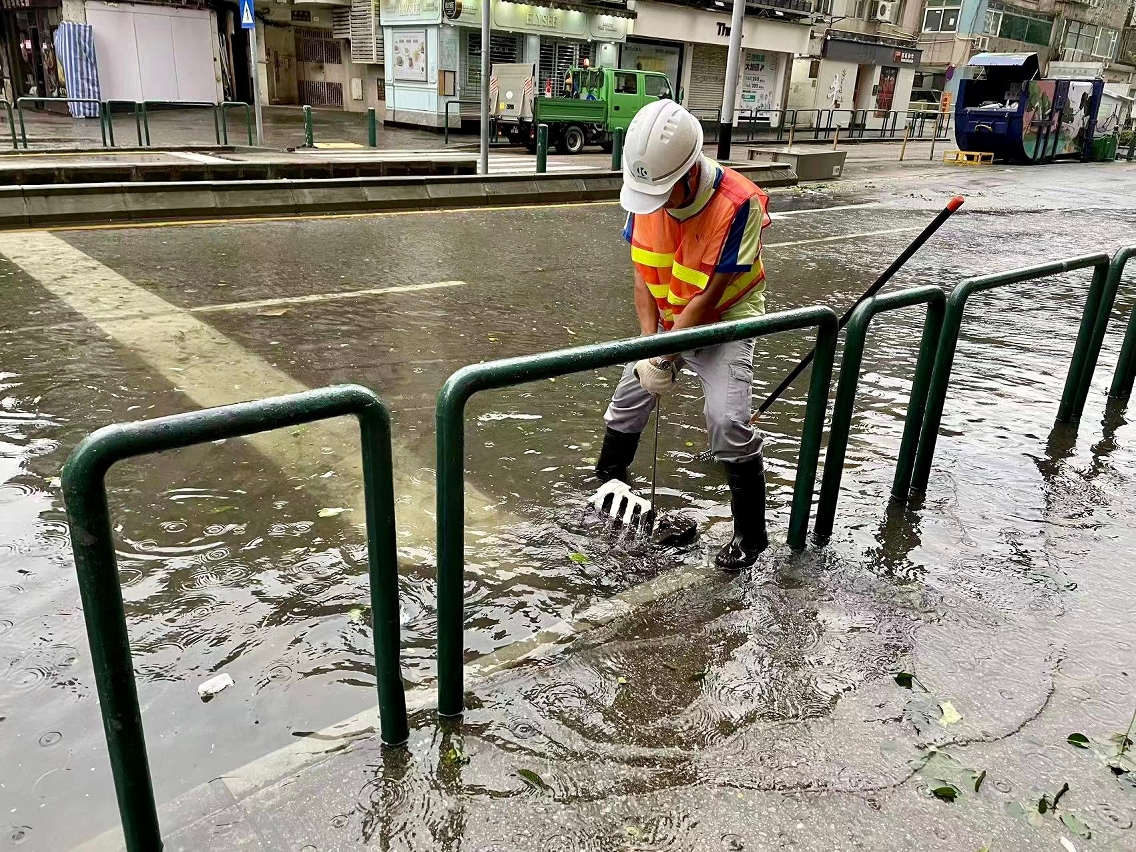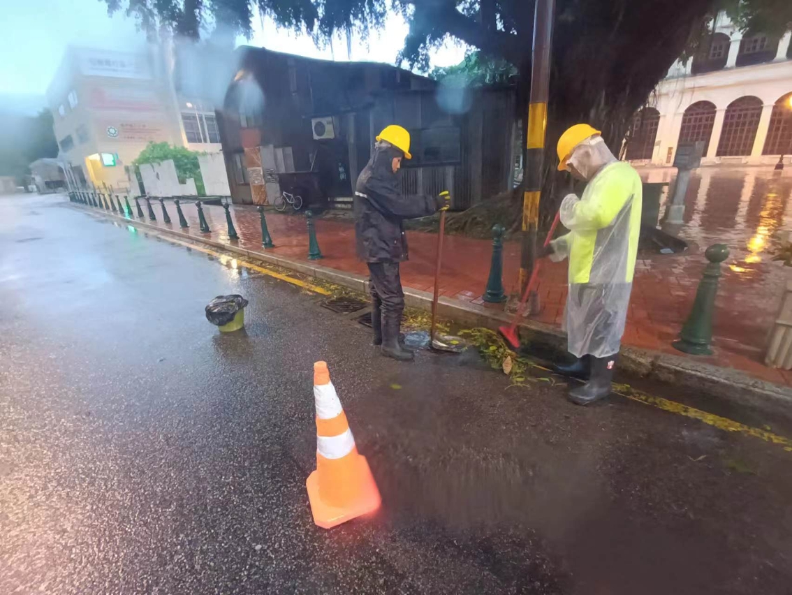 「蘇拉」襲澳期間,市政署持續派員在安全情況下清理渠口及路邊雜物,並用人手打用渠蓋疏導雨水,保持渠道暢通。