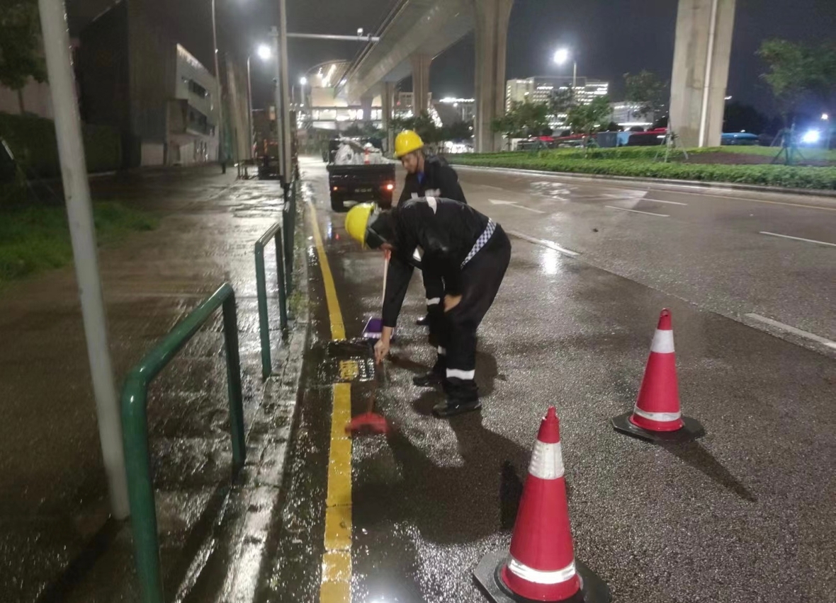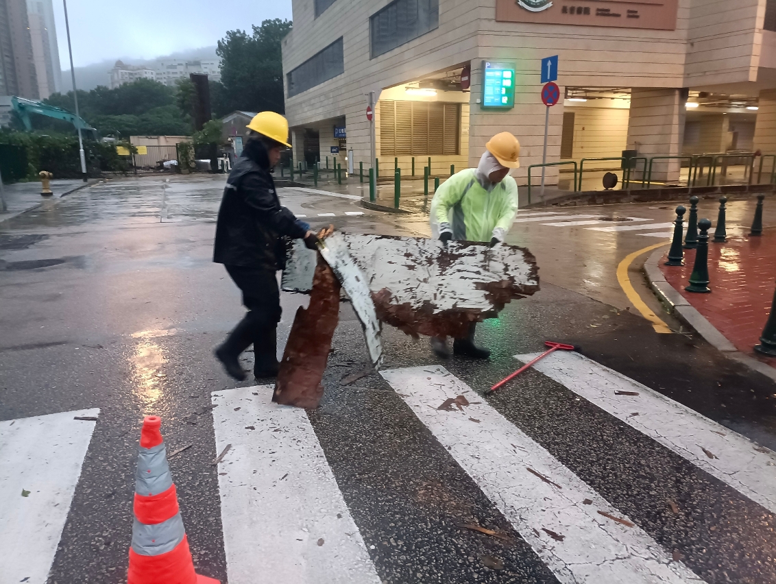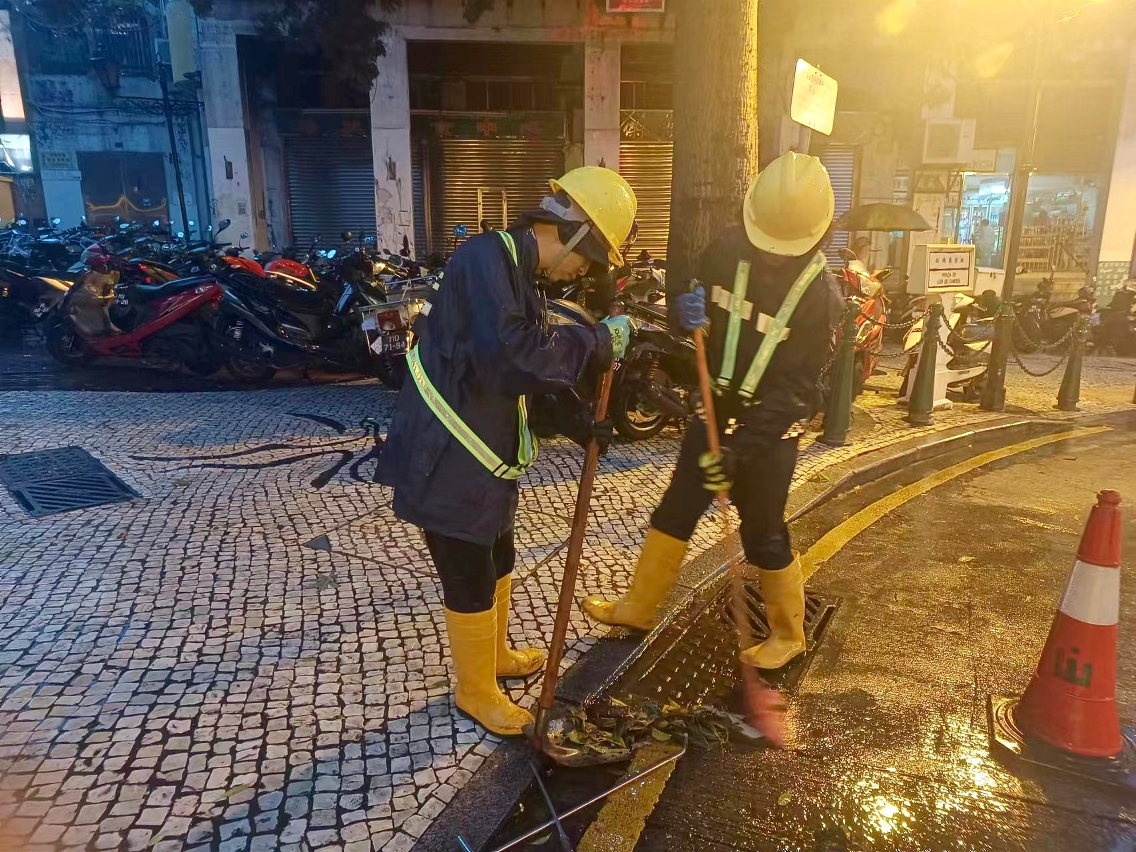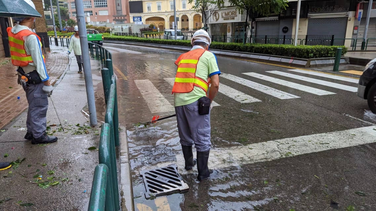 「蘇拉」襲澳期間,市政署持續派員在安全情況下清理渠口及路邊雜物,並用人手打用渠蓋疏導雨水,保持渠道暢通。