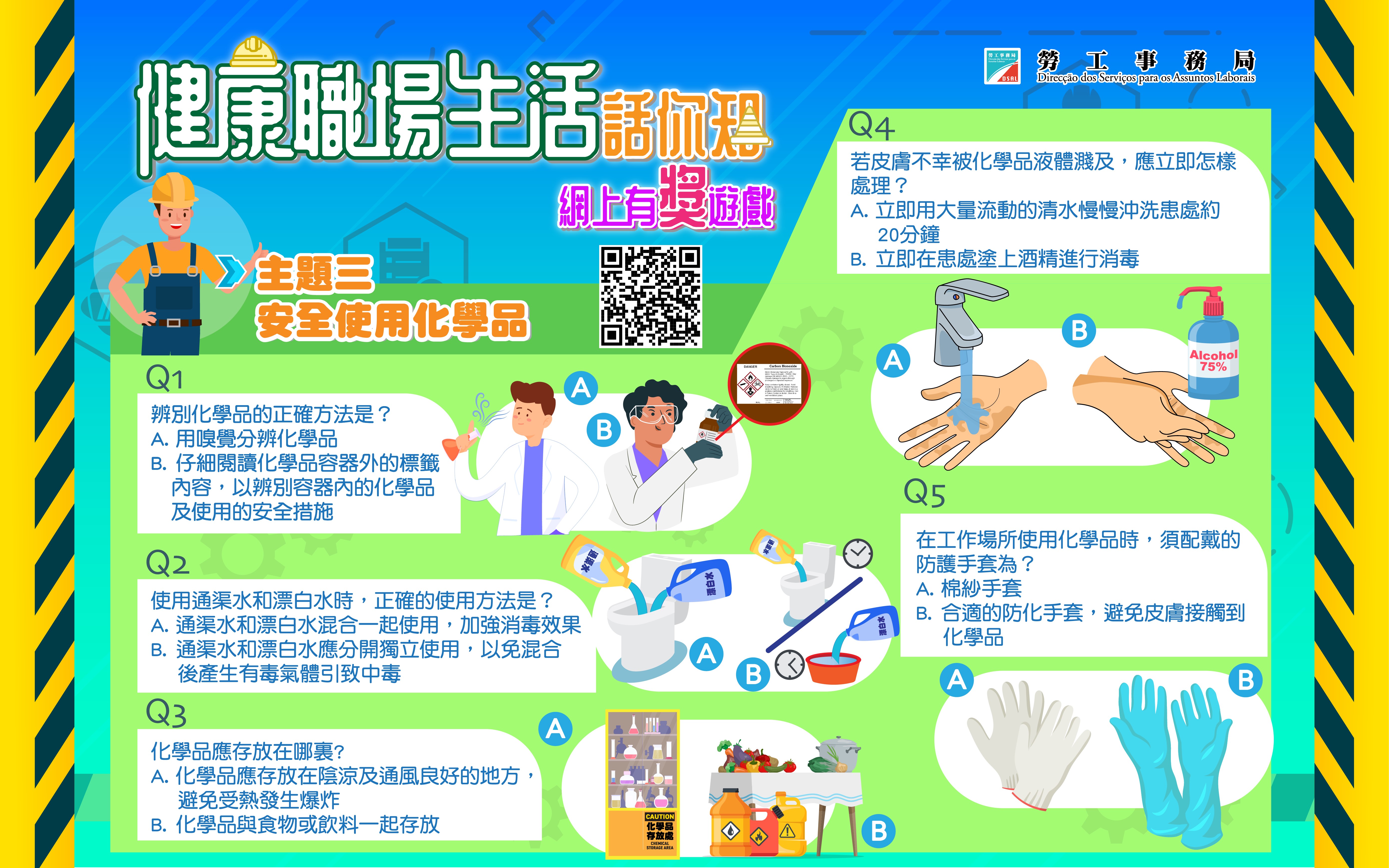 為持續提升市民對職業健康的關注,勞工局由9月4日起至10月15日期間推出第三期有奬遊戲,主題為“安全使用化學品”。歡迎有興趣的市民可透過勞工局手機應用程式或掃描二維碼參與遊戲。