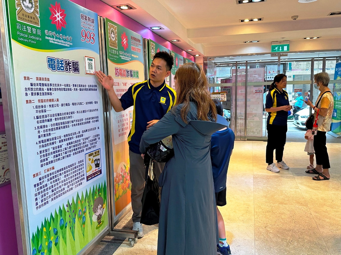 為提高居民預防電話及網絡詐騙的意識,司法警察局與“司警局大廈防罪之友”的社團成員合作,於社團轄下的辦事處及社區服務中心設立防騙宣傳教育展板,向居民宣講防騙資訊,提醒他們加強警惕,勿讓騙徒有機可乘。
