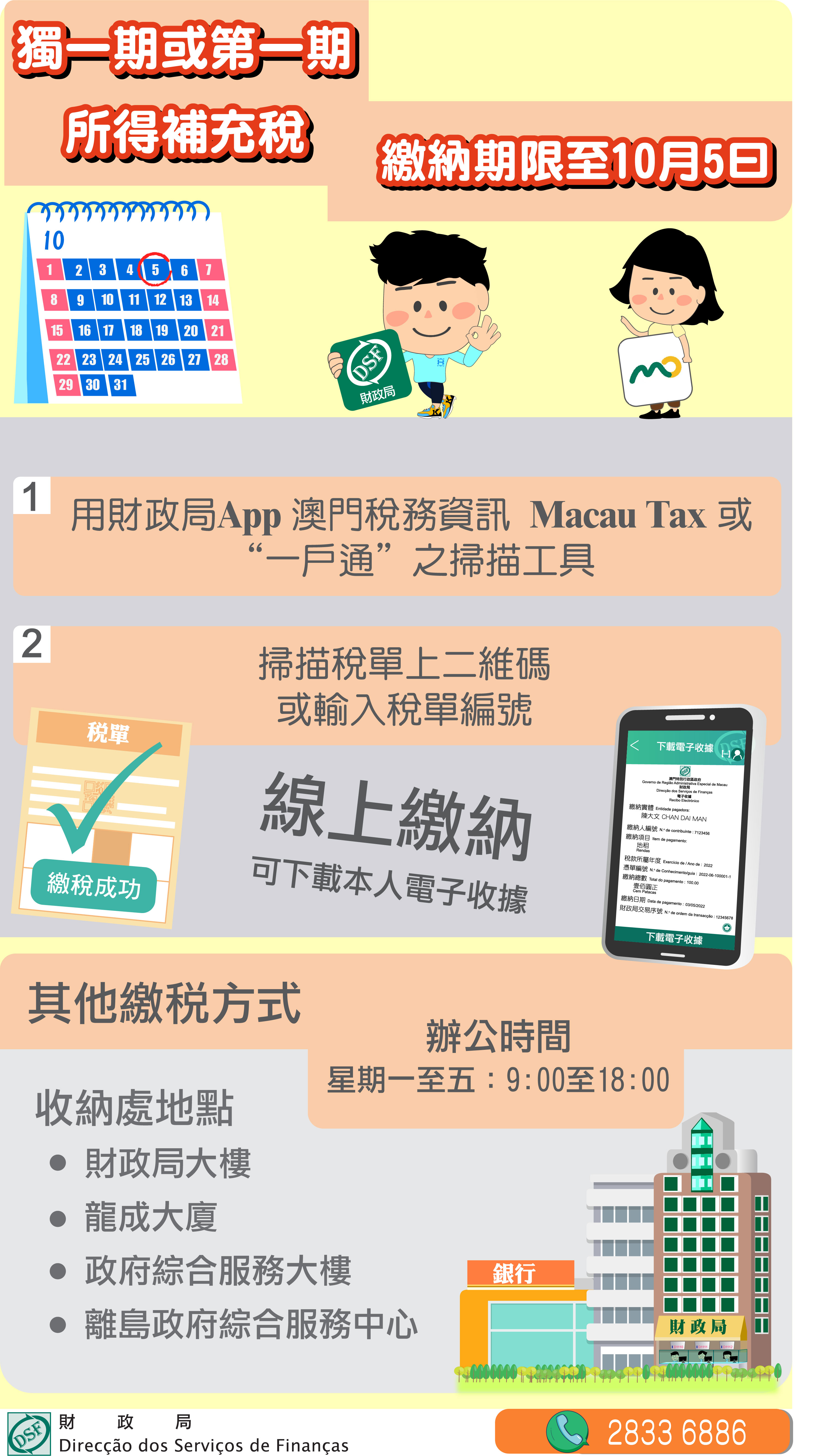 財政局提醒納稅人,繳納月份為9月的獨一期或第一期之所得補充稅,繳納期限至10月5日止,若第一期不按規定於法定期內繳納,將加徵過期利息及欠繳稅款百分之三,並引致第二期立即到期。