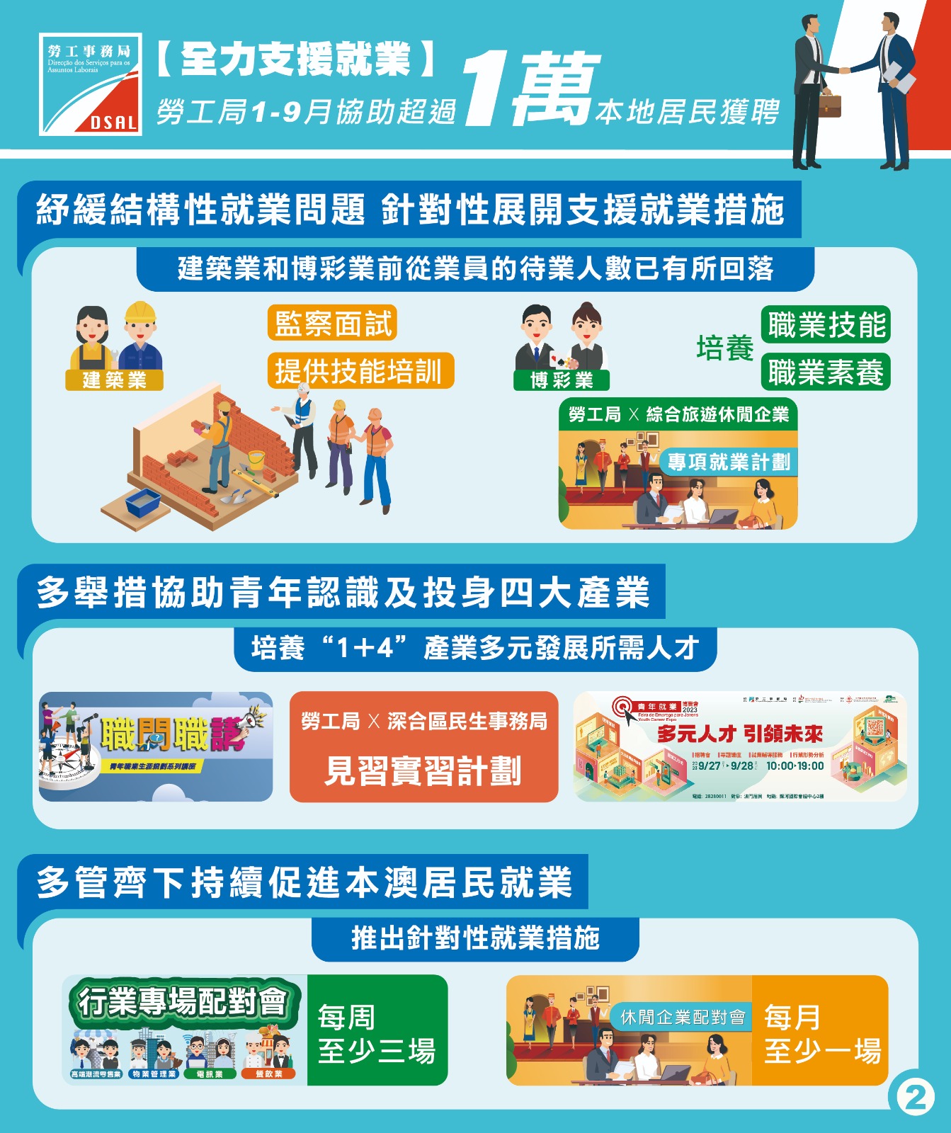 因應本澳經濟復甦,各行業人資需求出現調整,勞工局持續關注居民的就業情況,因應不同人士的就業需要,提供多元服務及支援,並持續加強與企業及團體合作,為求職者舉辦不同行業配對會,協助居民就業。