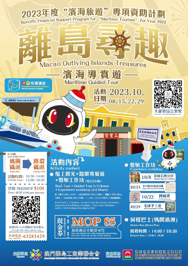 “離島尋趣‧濱海導賞遊” 將於10月8、15、22和29日,一連四個星期日進行,每日提供2班海上遊航班,由導遊帶領從媽閣碼頭出發,經海上遊航線前往路環碼頭。沿途介紹路環的歷史文化,並遊覽路環市區和體驗工作坊,參加者更有機會與澳門旅遊吉祥物“麥麥”互動和合照。活動也聯動區內商戶,提供消費優惠券,促進社區經濟。