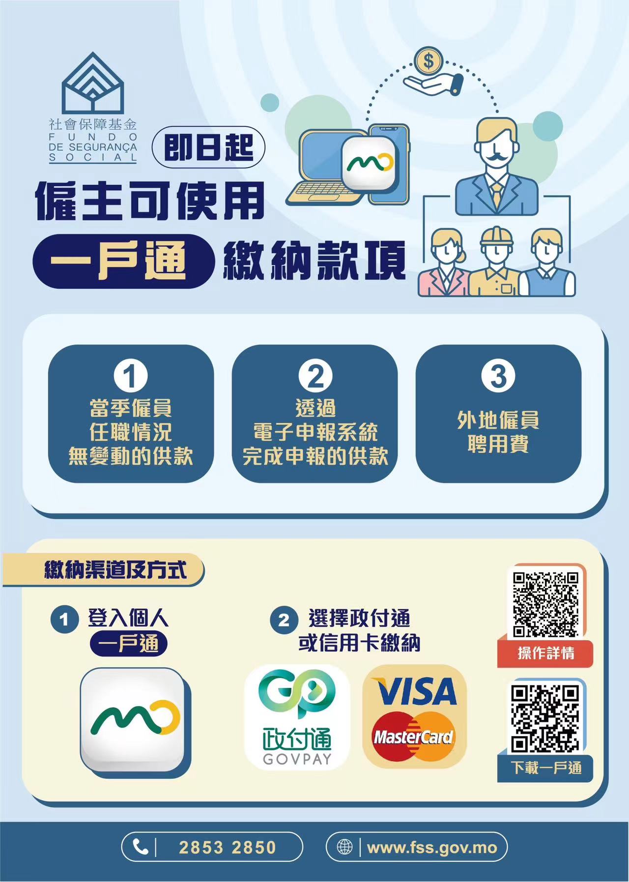 已開通電子申報服務的僱主應注意申報期限,以便透過自動轉帳或“一戶通”等方式繳納供款及外聘費;當季僱員任職情況沒有變動而未開通電子申報服務的僱主,亦可於社保基金網上平台查詢相關季度憑單編號及應繳金額(eservice.fss.gov.mo/Employer/cpa/Index),使用指定網上銀行繳款。