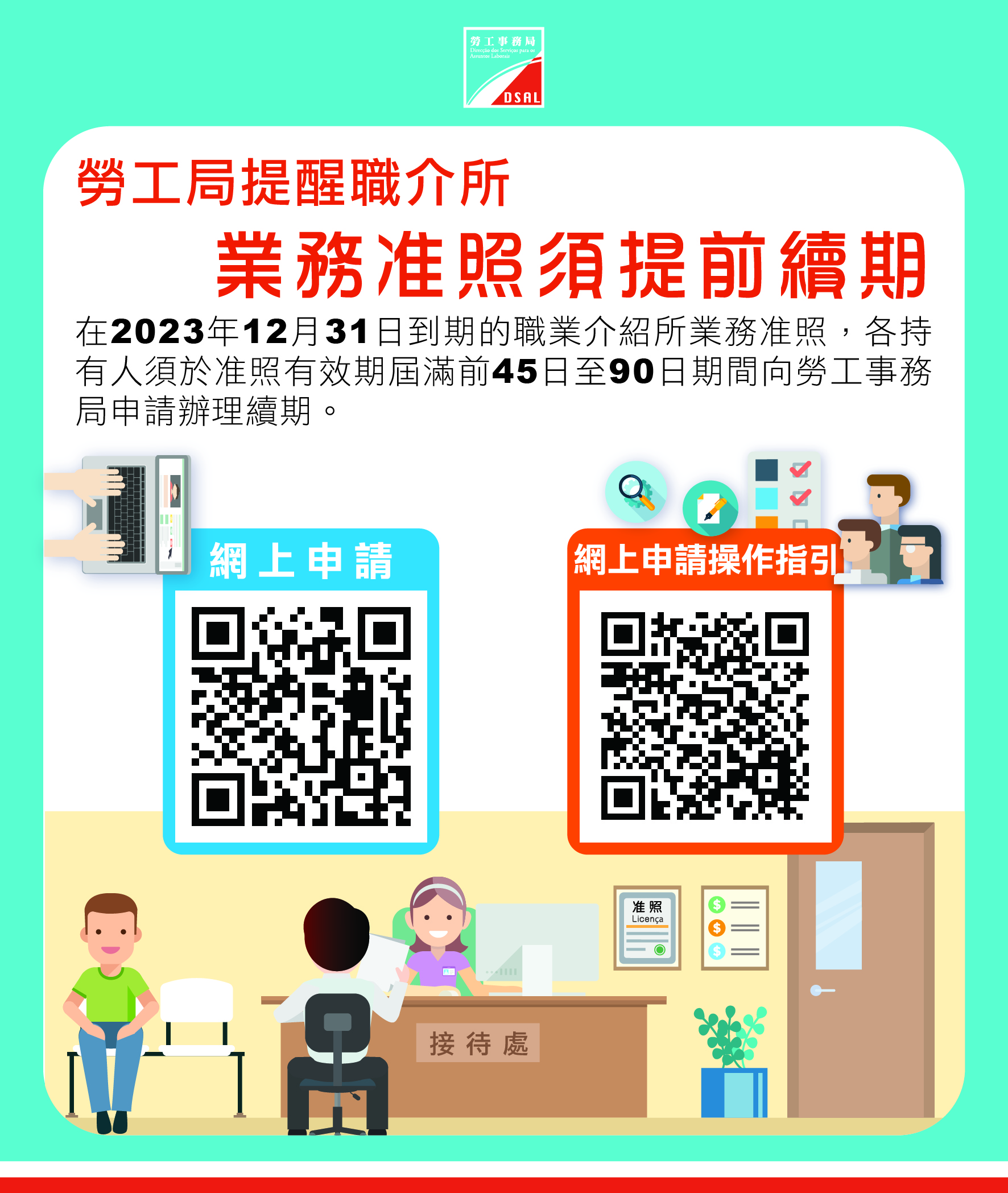 按照第16/2020號法律《職業介紹所業務法》規定,在2023年12月31日到期的職業介紹所業務准照,各持有人須於准照有效期屆滿前45日至90日期間向勞工事務局申請辦理續期。倘少於45日前提出,須額外繳付多1倍續期費用;另倘有效期屆滿前仍未提出,准照會被註銷。因此,准照持有人務必於法定期間內(即11月17日前)提出續期申請及提交所需的申請文件。續期可掃瞄二維碼於網上申請或以紙本提出申請。