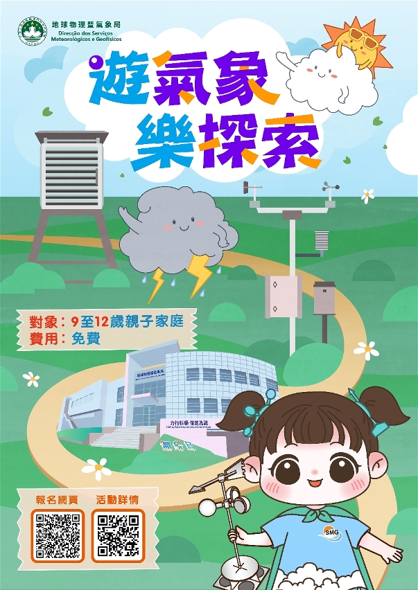 “遊氣象樂探索” 活動內容包括參觀氣象監察中心及氣象設施、進行互動遊戲及氣象工作坊等精彩節目。活動以家庭為單位,費用全免,每組家庭可登記2至5人,名額約30人。倘報名人數超過名額上限,將以電腦抽籤形式決定,並以短訊通知錄取人士。家長如欲瞭解更多活動詳情,可掃描活動宣傳圖上的二維碼或瀏覽氣象局網頁https://www.smg.gov.mo/zh/news-detail/506。
