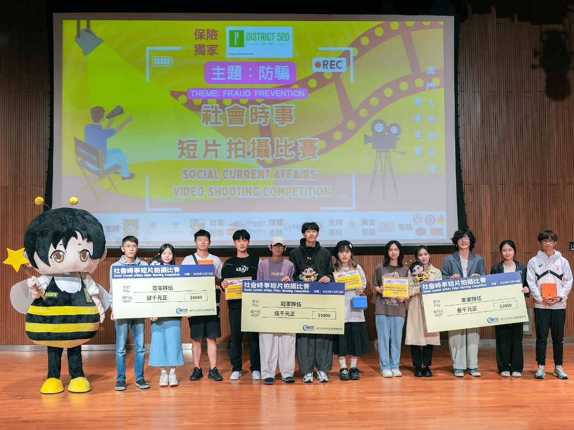 為鼓勵大學生關心社會和了解時事,澳門大學學生事務部與學生會傳播學會合辦首屆“社會時事短片拍攝比賽”,吸引近300名澳大學生圍繞“防騙”主題創作短片,共同宣揚防騙意識。