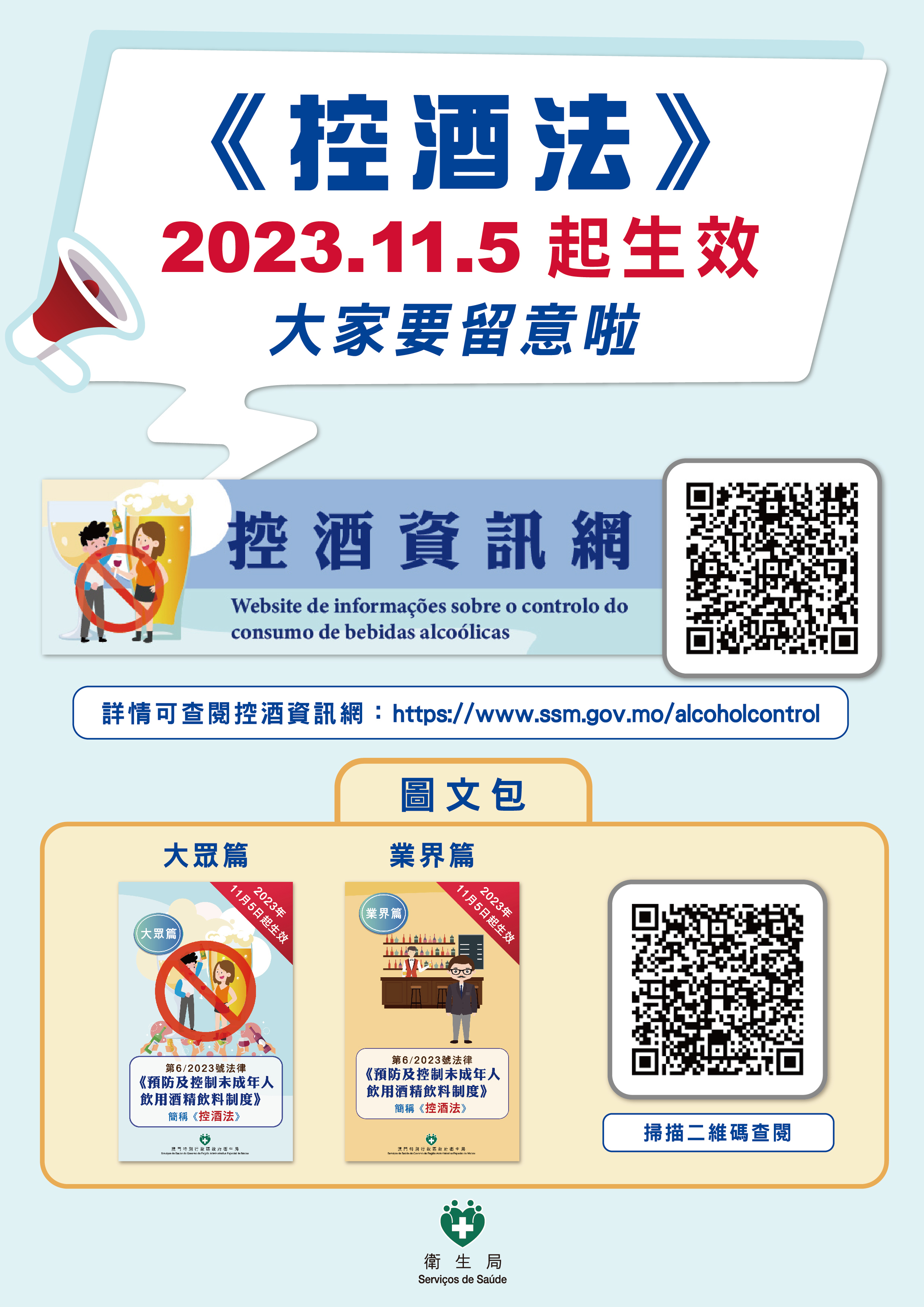 第6/2023號法律《預防及控制未成年人飲用酒精飲料制度》(下稱《控酒法》) 將於11月5日起正式生效。《控酒法》規定,銷售或提供酒精飲料的地方,須以顯眼方式張貼經行政長官批示核准禁止向未成年人銷售或提供酒精飲料的標誌。《控酒法》同時規定,屬提供自助服務的商業場所須劃定及清晰標示陳列酒精飲料及非酒精飲料的區域,而酒精飲料的廣告應以中文、葡文及英文標明警語。