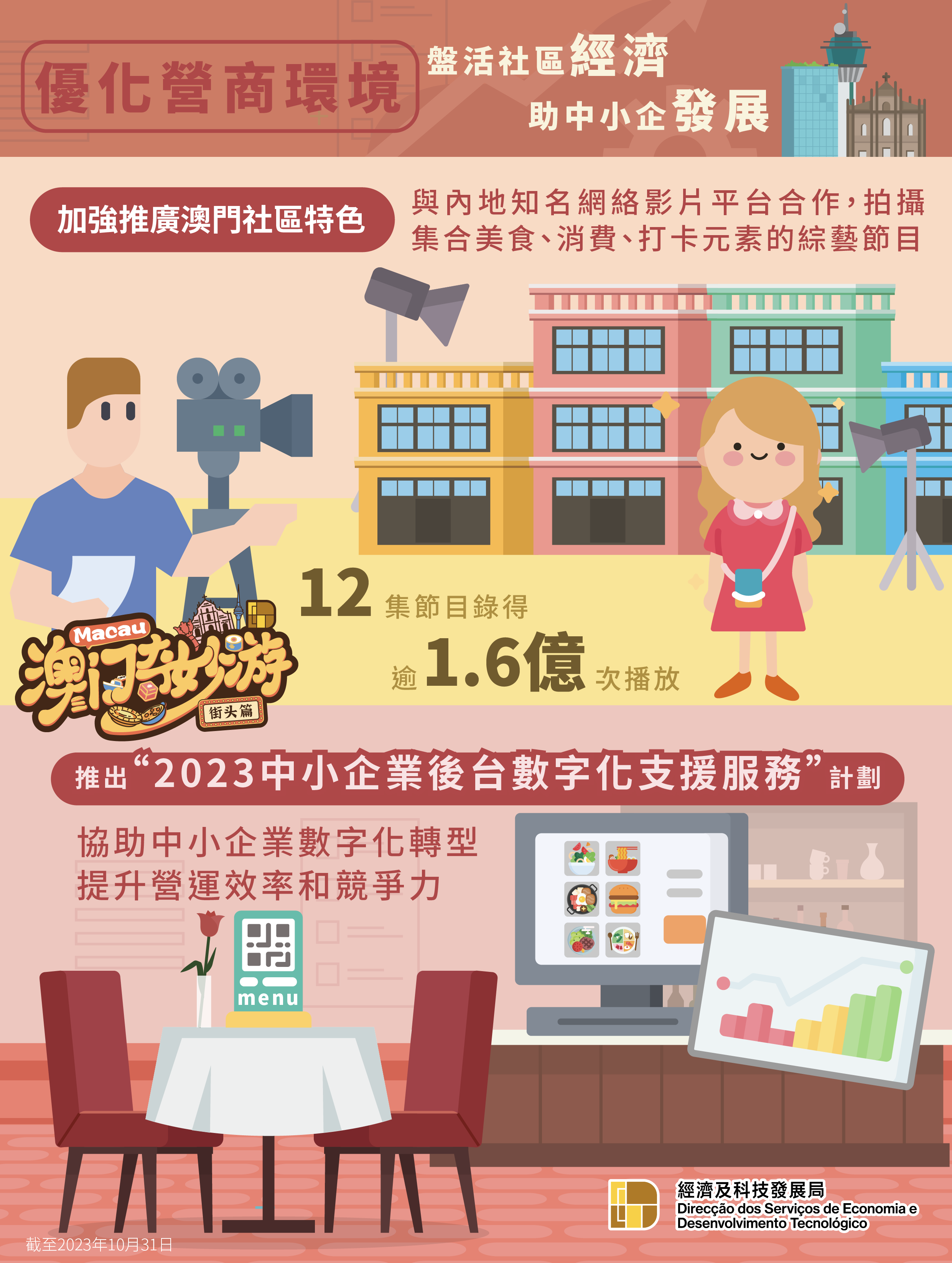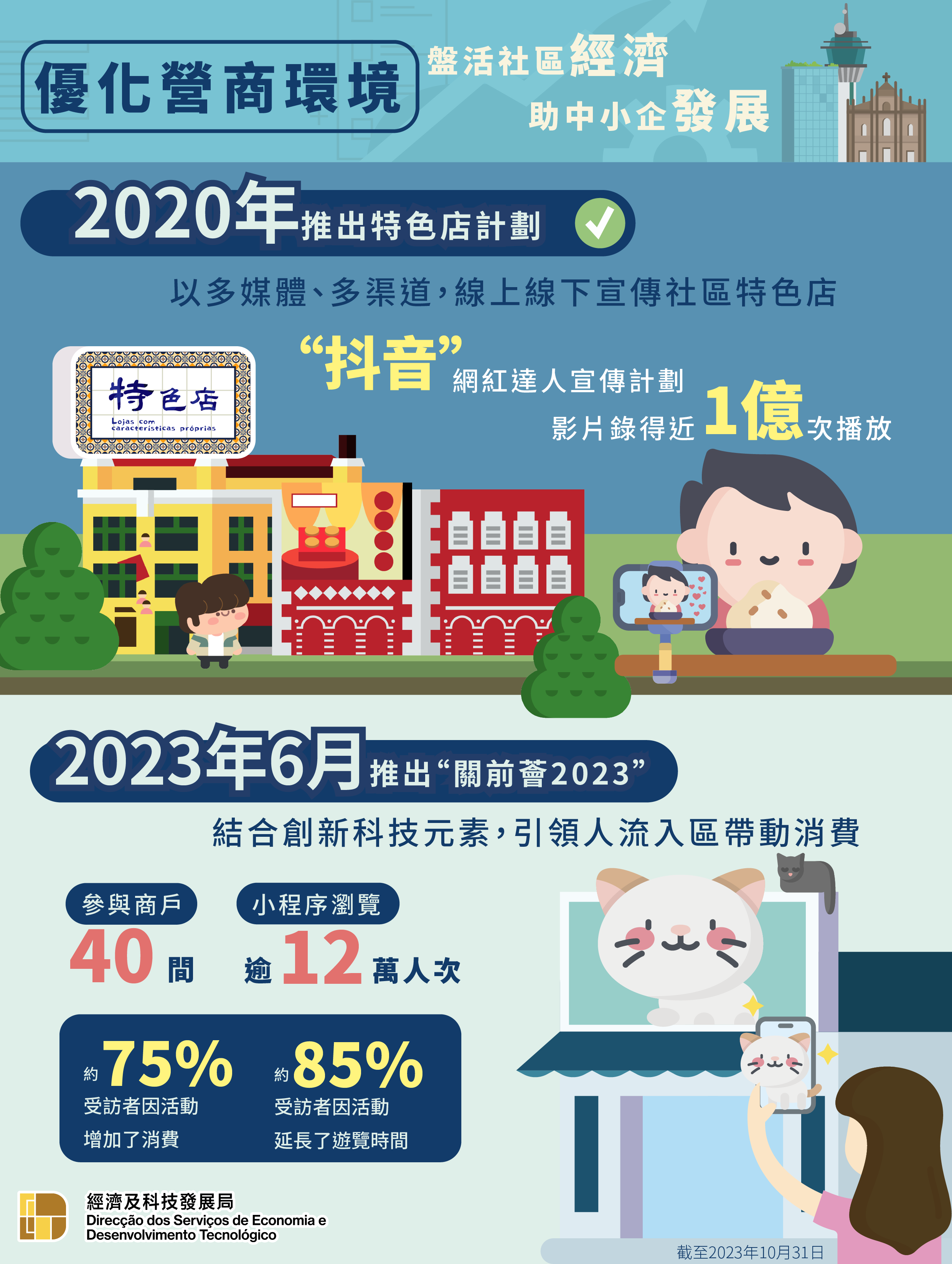 為持續優化營商環境,盤活社區經濟,特區政府採取多方面措施,助力本澳企業提升管理效率和競爭力,同時運用創新科技展現社區特色魅力,加強線上線下宣傳推廣,引領人流進入社區帶動消費。